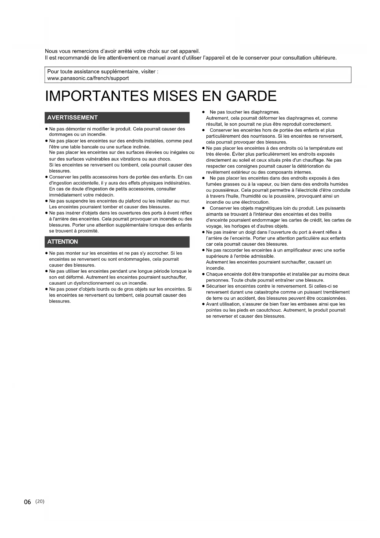 upérieure à l'entrée admissible. Autrement les enceintes pourraient surchauffer, causant un incendie. ≥ Chaque enceinte doit être transportée et installée par au moins deux personnes. Toute chute pourrait entraîner une blessure. ≥ Sécuriser les enceintes contre le renversement. Si celles-ci se renversent durant une catastrophe comme un puissant tremblement de terre ou un accident, des blessures peuvent être occasionnées. ≥ Avant utilisation, s’assurer de bien fixer les embases ainsi que les pointes ou les pieds en caoutchouc. Autrement, le produit pourrait se renverser et causer des blessures. Pour toute assistance supplémentaire, visiter : www.panasonic.ca/french/support AVERTISSEMENT ATTENTION