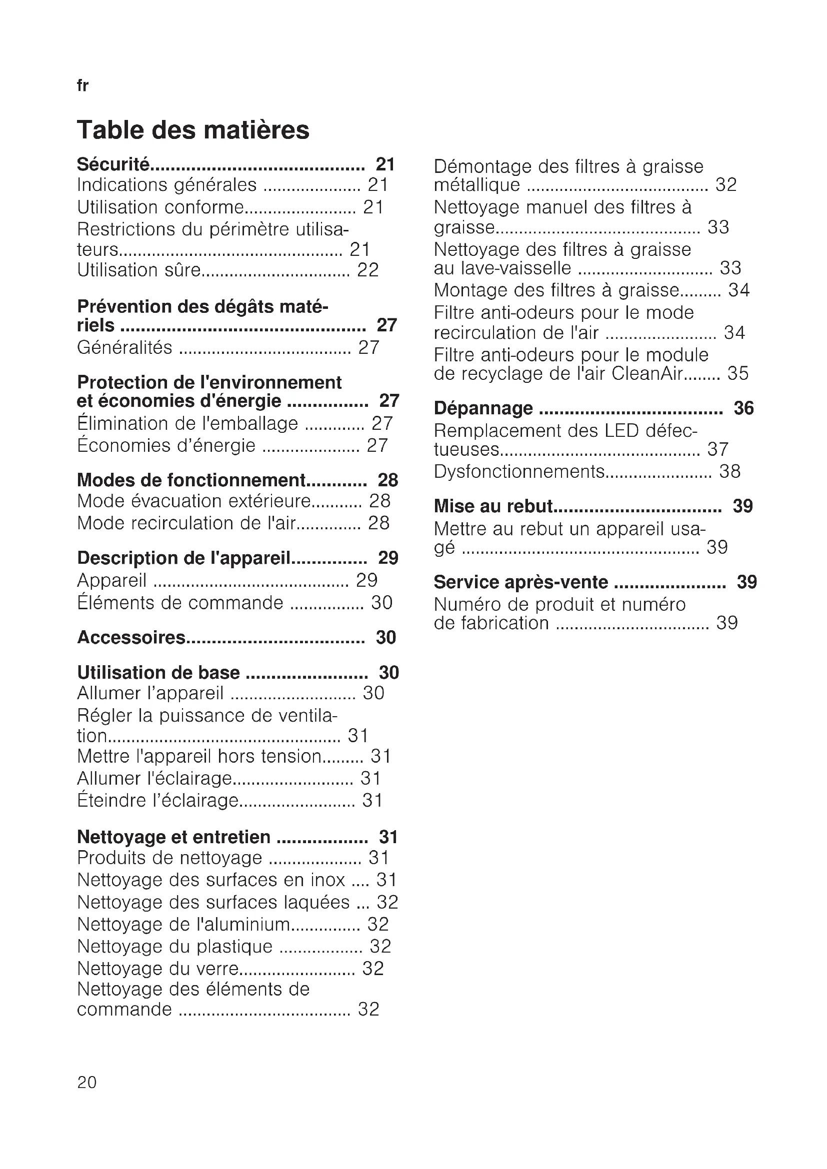 Si l'appareil est utilisé exclusivement en mode recirculation de l'air, le fonctionnement est possible sans restriction. AVERTISSEMENT‒Risque d'incendie! ¡ Les dépôts de graisse dans les filtres à graisse peuvent s'en- flammer.