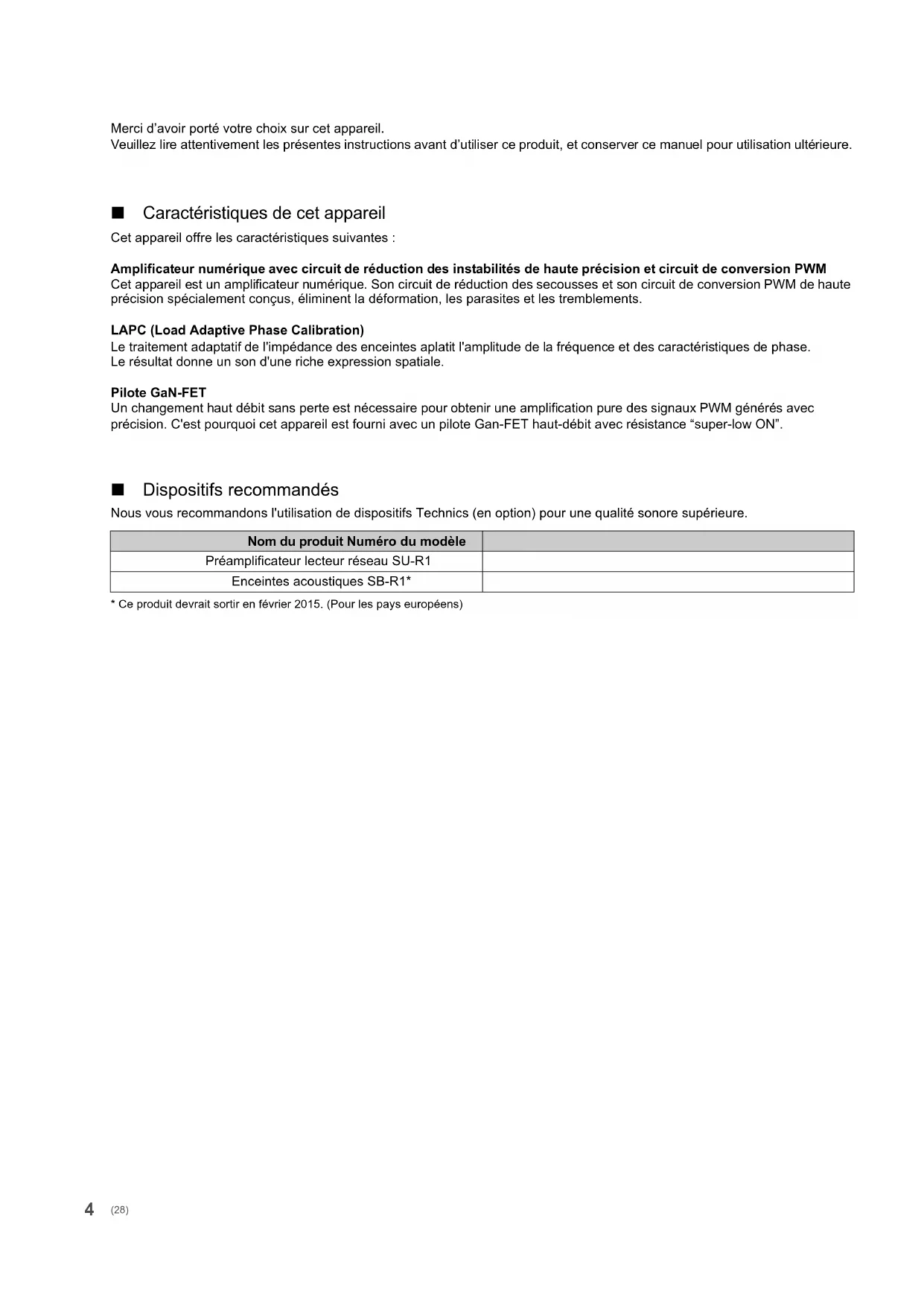 - Ce produit devrait sortir en février 2015. (Pour les pays européens) Nom du produit Numéro du modèle Préamplificateur lecteur réseau SU-R1 Enceintes acoustiques SB-R1* (28) SE-R1E-SQT0461-ref_mst.book 4 ページ 2015年1月22日 木曜日 午後3時9分Français