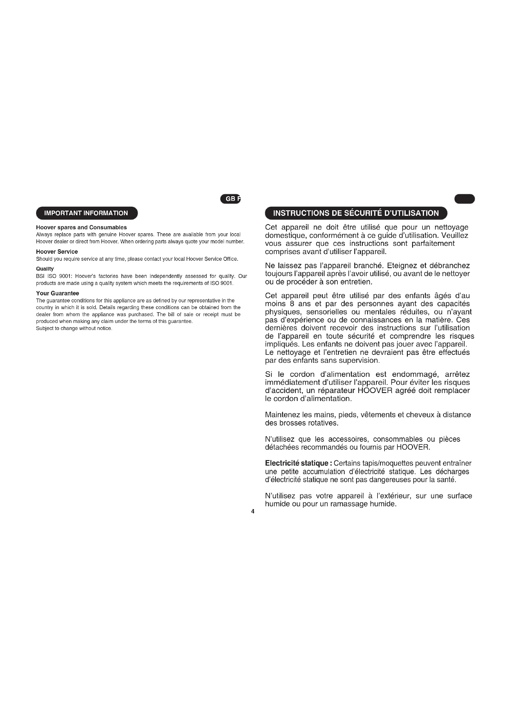 INFORMATIONS IMPORTANTES Pièces détachées et consommables Hoover Toujours remplacer les pièces par des pièces détachées de la marque Hoover. Celles- ci sont disponibles auprès de votre revendeur Hoover. Lors de la commande de pièces, veuillez toujours préciser le numéro de votre modèle. Service Hoover Pour toute intervention à tout moment, veuillez contacter le service après-vente Hoover le plus proche. Qualité BSI ISO 9001: La qualité des usines Hoover a fait l’objet d’une évaluation indépendante. Nos produits sont fabriqués selon un système de qualité conforme à la norme ISO 9001. Votregarantie Les conditions de garantie de cet appareil sont dénies par notre représentant dans le pays où il est vendu et peuvent être obtenues auprès de votre revendeur. Les détails concernant ces conditions peuvent être obtenues auprès du revendeur auprès duquel l’appareil a été acheté. La facture d’achat ou le reçu doivent être présentés pour toutes réclamations relevant des conditions de cette garantie. Ces conditions peuvent être modiées sans préavis.
