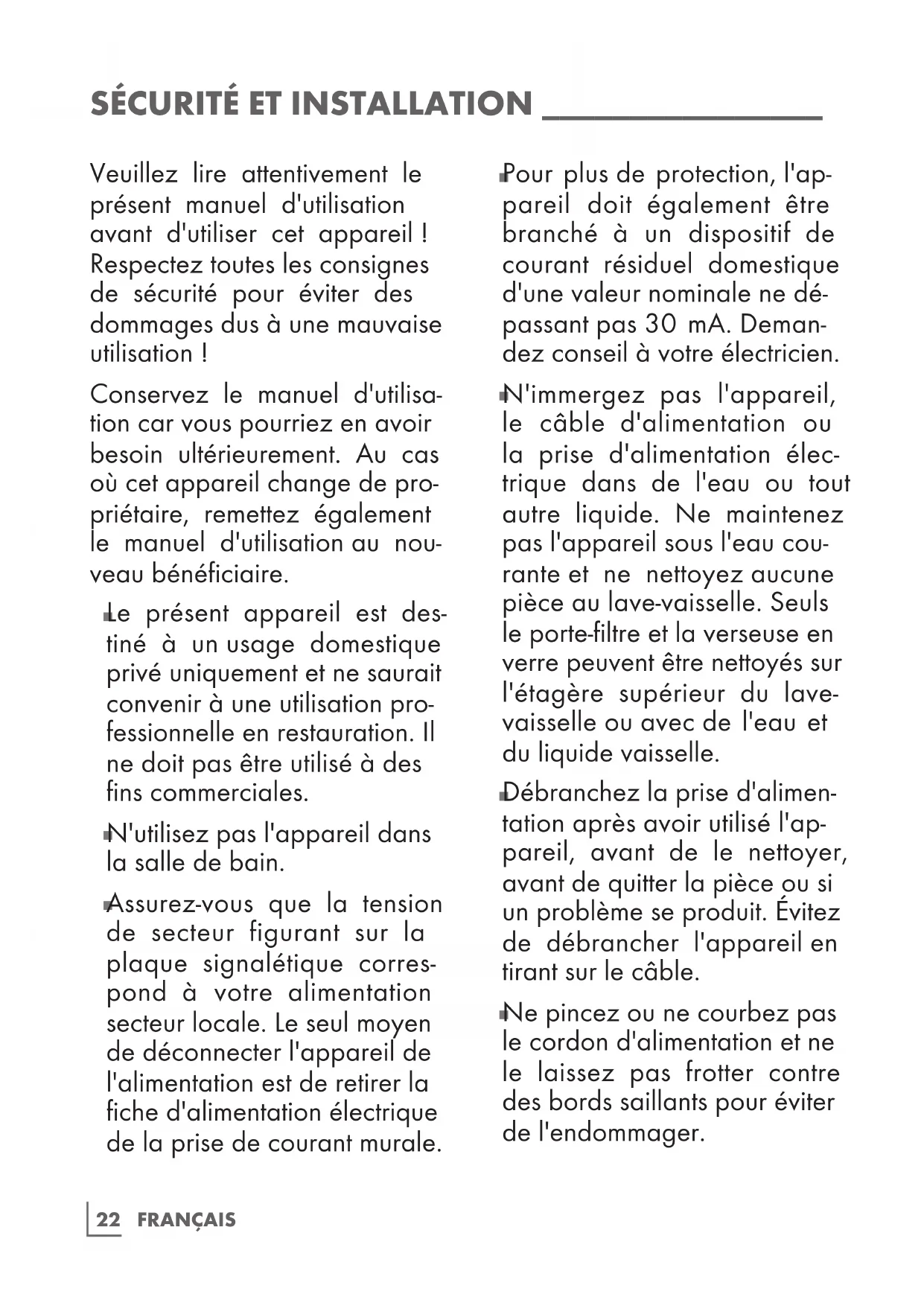 Le présent appareil est des- tiné à un usage domestique privé uniquement et ne saurait convenir à une utilisation pro- fessionnelle en restauration. Il ne doit pas être utilisé à des fins commerciales.