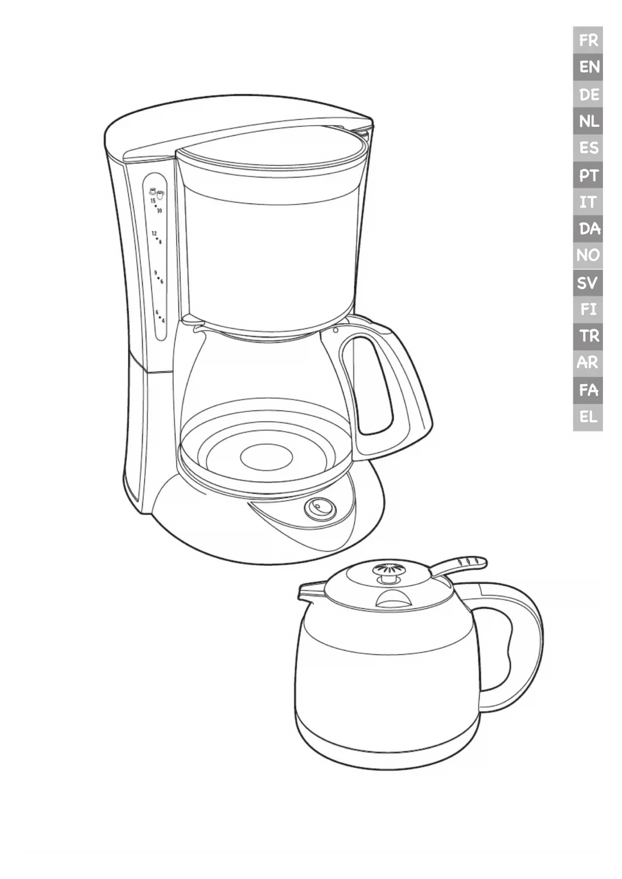 - détartrez votre cafetière. Votre appareil ne fonctionne toujours pas ? Adressez-vous à un centre service agréé. Participons à la protection de l’environnement ! i Votre appareil contient de nombreux matériaux valorisables ou recyclables. ‹Confiez celui-ci dans un point de collecte pour que son traitement soit effectué. a Lid b Tank c Filter holder d Warming plate e On / off button or control panel f Measuring spoon g Jug or insulated pot (according to model) Programmable models h LCD screen i On / off button j AUTO button k PRO button l Programming indicator light (green) m HR button n MIN button o On / off indicator light (red)