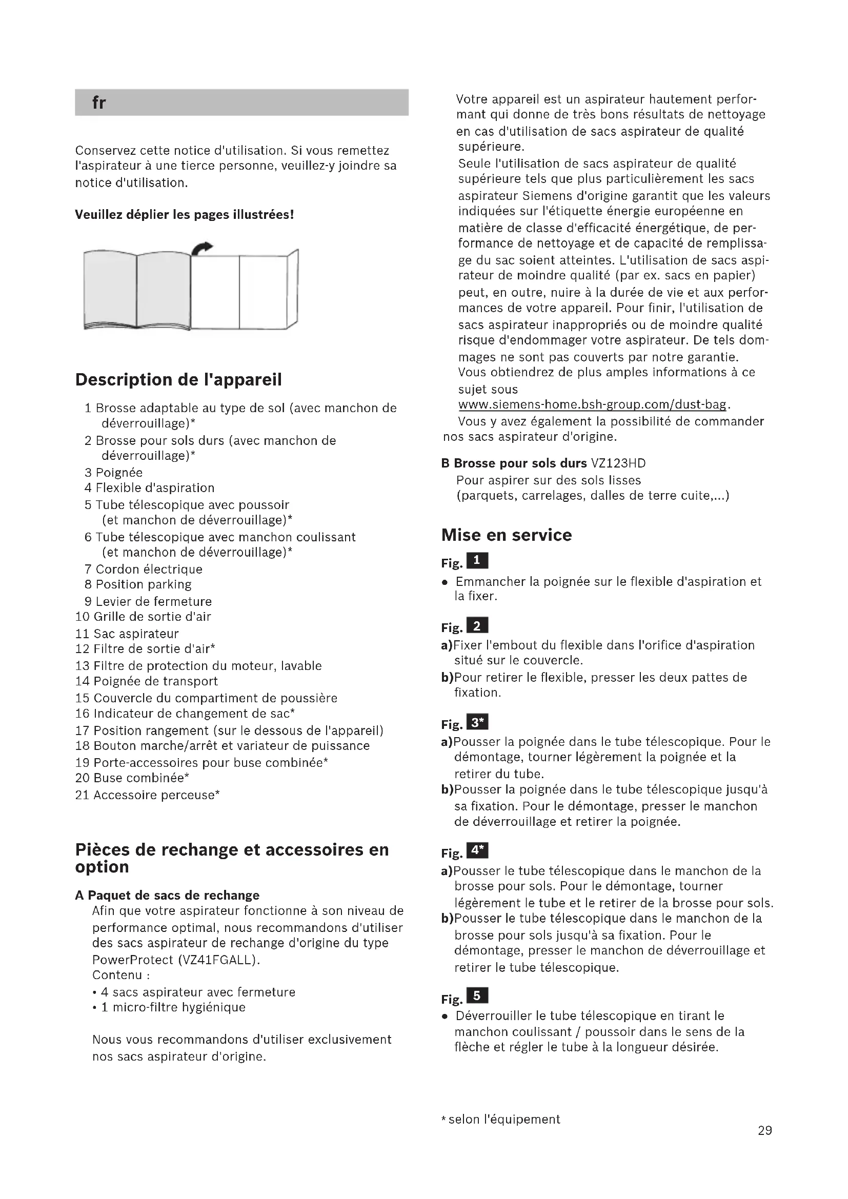 Conservez cette notice d'utilisation. Si vous remettez l'aspirateur à une tierce personne, veuillez-y joindre sa notice d'utilisation. Veuillez déplier les pages illustrées! Description de l'appareil 1 Brosse adaptable au type de sol (avec manchon de déverrouillage)* 2 Brosse pour sols durs (avec manchon de déverrouillage)* 3 Poignée 4 Flexible d'aspiration 5 Tube télescopique avec poussoir (et manchon de déverrouillage)* 6 Tube télescopique avec manchon coulissant (et manchon de déverrouillage)* 7 Cordon électrique 8 Position parking 9 Levier de fermeture 10 Grille de sortie d'air 11 Sac aspirateur 12 Filtre de sortie d'air* 13 Filtre de protection du moteur, lavable 14 Poignée de transport 15 Couvercle du compartiment de poussière 16 Indicateur de changement de sac* 17 Position rangement (sur le dessous de l'appareil) 18 Bouton marche/arrêt et variateur de puissance 19 Porte-accessoires pour buse combinée* 20 Buse combinée* 21 Accessoire perceuse* Pièces de rechange et accessoires en option A Paquet de sacs de rechange Afin que votre aspirateur fonctionne à son niveau de performance optimal, nous recommandons d'utiliser des sacs aspirateur de rechange d'origine du type PowerProtect (VZ41FGALL). Contenu :