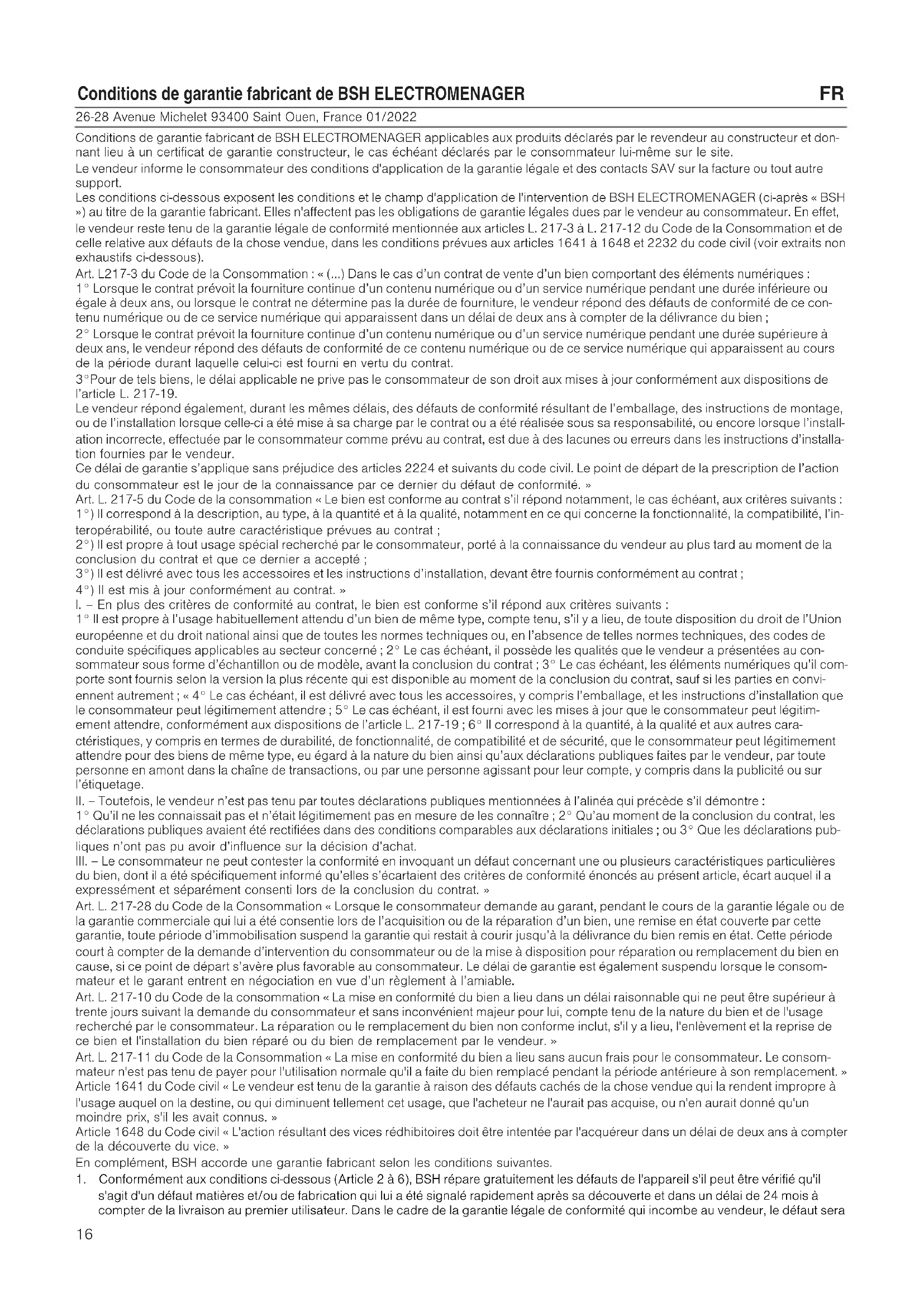 26-28 Avenue Michelet 93400 Saint Ouen, France 01/2022 Conditions de garantie fabricant de BSH ELECTROMENAGER applicables aux produits déclarés par le revendeur au constructeur et don- nant lieu à un certificat de garantie constructeur, le cas échéant déclarés par le consommateur lui-même sur le site. Le vendeur informe le consommateur des conditions d'application de la garantie légale et des contacts SAV sur la facture ou tout autre support. Les conditions ci-dessous exposent les conditions et le champ d'application de l'intervention de BSH ELECTROMENAGER (ci-après « BSH ») au titre de la garantie fabricant. Elles n'affectent pas les obligations de garantie légales dues par le vendeur au consommateur. En effet, le vendeur reste tenu de la garantie légale de conformité mentionnée aux articles L. 217-3 à L. 217-12 du Code de la Consommation et de celle relative aux défauts de la chose vendue, dans les conditions prévues aux articles 1641 à 1648 et 2232 du code civil (voir extraits non exhaustifs ci-dessous). Art. L217-3 du Code de la Consommation : « (…) Dans le cas d’un contrat de vente d’un bien comportant des éléments numériques : 1° Lorsque le contrat prévoit la fourniture continue d’un contenu numérique ou d’un service numérique pendant une durée inférieure ou égale à deux ans, ou lorsque le contrat ne détermine pas la durée de fourniture, le vendeur répond des défauts de conformité de ce con- tenu numérique ou de ce service numérique qui apparaissent dans un délai de deux ans à compter de la délivrance du bien ; 2° Lorsque le contrat prévoit la fourniture continue d’un contenu numérique ou d’un service numérique pendant une durée supérieure à deux ans, le vendeur répond des défauts de conformité de ce contenu numérique ou de ce service numérique qui apparaissent au cours de la période durant laquelle celui-ci est fourni en vertu du contrat. 3°Pour de tels biens, le délai applicable ne prive pas le consommateur de son droit aux mises à jour conformément aux dispositions de l’article L. 217-19. Le vendeur répond également, durant les mêmes délais, des défauts de conformité résultant de l’emballage, des instructions de montage, ou de l’installation lorsque celle-ci a été mise à sa charge par le contrat ou a été réalisée sous sa responsabilité, ou encore lorsque l’install- ation incorrecte, effectuée par le consommateur comme prévu au contrat, est due à des lacunes ou erreurs dans les instructions d’installa- tion fournies par le vendeur. Ce délai de garantie s’applique sans préjudice des articles 2224 et suivants du code civil. Le point de départ de la prescription de l’action du consommateur est le jour de la connaissance par ce dernier du défaut de conformité. » Art. L. 217-5 du Code de la consommation « Le bien est conforme au contrat s’il répond notamment, le cas échéant, aux critères suivants : 1°) Il correspond à la description, au type, à la quantité et à la qualité, notamment en ce qui concerne la fonctionnalité, la compatibilité, l’in- teropérabilité, ou toute autre caractéristique prévues au contrat ; 2°) Il est propre à tout usage spécial recherché par le consommateur, porté à la connaissance du vendeur au plus tard au moment de la conclusion du contrat et que ce dernier a accepté ; 3°) Il est délivré avec tous les accessoires et les instructions d’installation, devant être fournis conformément au contrat ; 4°) Il est mis à jour conformément au contrat. »