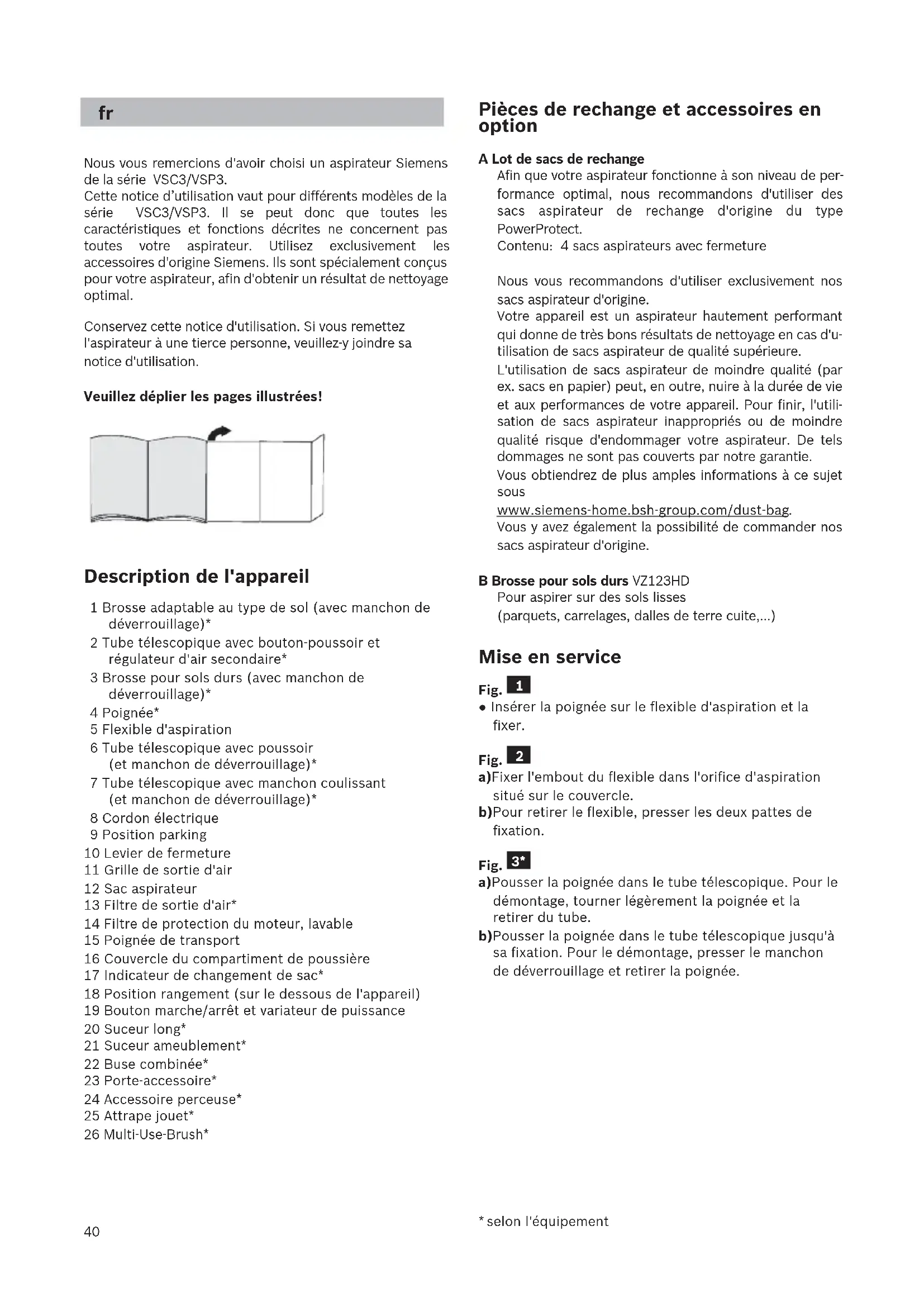 Nous vous remercions d'avoir choisi un aspirateur Siemens de la série VSC3/VSP3. Cette notice d’utilisation vaut pour différents modèles de la série VSC3/VSP3. Il se peut donc que toutes les caractéristiques et fonctions décrites ne concernent pas toutes votre aspirateur. Utilisez exclusivement les accessoires d'origine Siemens. Ils sont spécialement conçus pour votre aspirateur, afin d'obtenir un résultat de nettoyage optimal. Conservez cette notice d'utilisation. Si vous remettez l'aspirateur à une tierce personne, veuillez-y joindre sa notice d'utilisation. Veuillez déplier les pages illustrées! Description de l'appareil 1 Brosse adaptable au type de sol (avec manchon de déverrouillage)* 2 Tube télescopique avec bouton-poussoir et régulateur d'air secondaire* 3 Brosse pour sols durs (avec manchon de déverrouillage)* 4 Poignée* 5 Flexible d'aspiration 6 Tube télescopique avec poussoir (et manchon de déverrouillage)* 7 Tube télescopique avec manchon coulissant (et manchon de déverrouillage)* 8 Cordon électrique 9 Position parking 10 Levier de fermeture 11 Grille de sortie d'air 12 Sac aspirateur 13 Filtre de sortie d'air* 14 Filtre de protection du moteur, lavable 15 Poignée de transport 16 Couvercle du compartiment de poussière 17 Indicateur de changement de sac* 18 Position rangement (sur le dessous de l'appareil) 19 Bouton marche/arrêt et variateur de puissance 20 Suceur long* 21 Suceur ameublement* 22 Buse combinée* 23 Porte-accessoire* 24 Accessoire perceuse* 25 Attrape jouet* 26 Multi-Use-Brush* Pièces de rechange et accessoires en option A Lot de sacs de rechange Afin que votre aspirateur fonctionne à son niveau de per- formance optimal, nous recommandons d'utiliser des sacs aspirateur de rechange d'origine du type PowerProtect. Contenu: 4 sacs aspirateurs avec fermeture Nous vous recommandons d'utiliser exclusivement nos sacs aspirateur d'origine. Votre appareil est un aspirateur hautement performant qui donne de très bons résultats de nettoyage en cas d'u- tilisation de sacs aspirateur de qualité supérieure. L'utilisation de sacs aspirateur de moindre qualité (par ex. sacs en papier) peut, en outre, nuire à la durée de vie et aux performances de votre appareil. Pour finir, l'utili- sation de sacs aspirateur inappropriés ou de moindre qualité risque d'endommager votre aspirateur. De tels dommages ne sont pas couverts par notre garantie. Vous obtiendrez de plus amples informations à ce sujet sous www.siemens-home.bsh-group.com/dust-bag