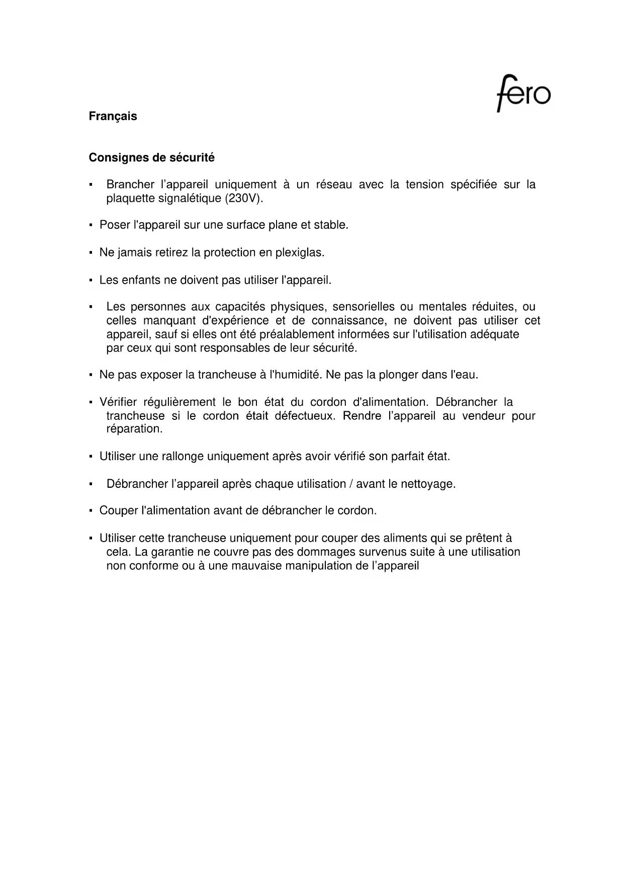 - Utiliser cette trancheuse uniquement pour couper des alimentés qui se présent à cela. La garantie ne couvre pas des dommages survenus suite à une utilisation non conforme ou à une mauvaise manipulation de l'appareil