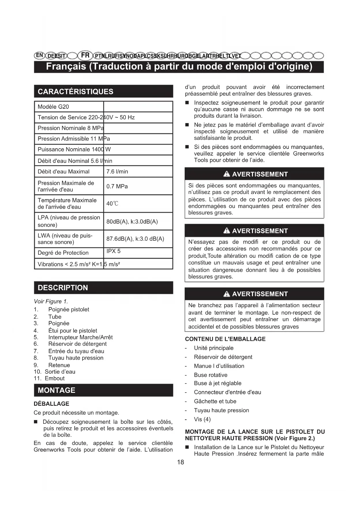 Téléchargez la notice de votre Nettoyeur haute pression au format PDF gratuitement ! Retrouvez votre notice G20 - GREENWORKS et reprennez votre appareil électronique en main. Sur cette page sont publiés tous les documents nécessaires à l'utilisation de votre appareil G20 de la marque GREENWORKS.