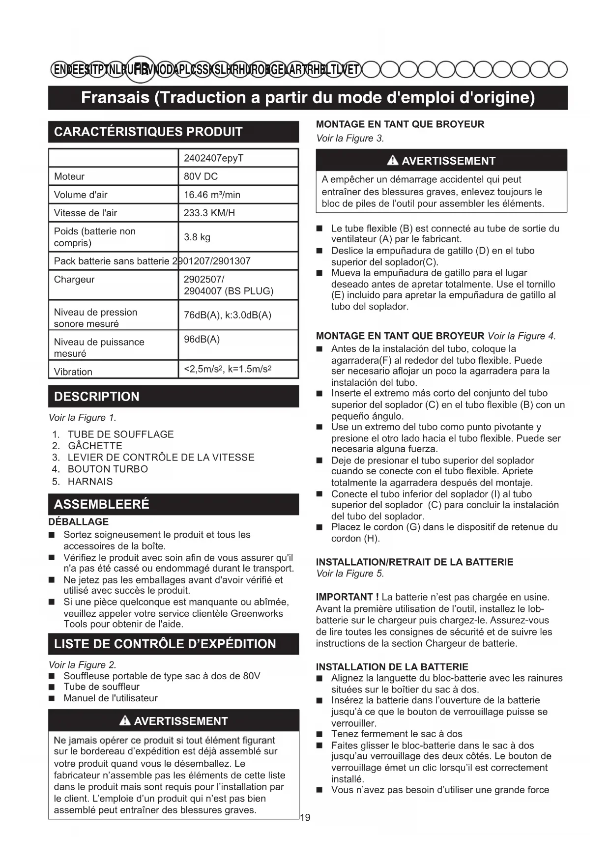 ASSEMBLEERÉ DÉBALLAGE Sortez soigneusement le produit et tous les accessoires de la boîte. Vérifiez le produit avec soin afin de vous assurer qu'il n'a pas été cassé ou endommagé durant le transport. Ne jetez pas les emballages avant d'avoir vérifié et utilisé avec succès le produit. Si une pièce quelconque est manquante ou abîmée, veuillez appeler votre service clientèle Greenworks Tools pour obtenir de l'aide. LISTE DE CONTRÔLE D’EXPÉDITION Voir la Figure 2. Souffleuse portable de type sac à dos de 80V Tube de souffleur Manuel de l'utilisateur AVERTISSEMENT sur le bordereau d’expédition est déjà assemblé survotre produit quand vous le désemballez. Lefabricateur n’assemble pas les éléments de cette listedans le produit mais sont requis pour l’installation parle client. L’emploie d’un produit qui n’est pas bienassemblé peut entraîner des blessures graves.MONTAGE EN TANT QUE BROYEUR Voir la Figure 3. AVERTISSEMENT A empêcher un démarrage accidentel qui peutentraîner des blessures graves, enlevez toujours lebloc de piles de l’outil pour assembler les éléments. Le tube flexible (B) est connecté au tube de sortie du ventilateur (A) par le fabricant. Deslice la empuñadura de gatillo (D) en el tubo superior del soplador(C). Mueva la empuñadura de gatillo para el lugar deseado antes de apretar totalmente. Use el tornillo (E) incluido para apretar la empuñadura de gatillo al tubo del soplador. MONTAGE EN TANT QUE BROYEUR Voir la Figure 4. Antes de la instalación del tubo, coloque la agarradera(F) al rededor del tubo flexible. Puede ser necesario aflojar un poco la agarradera para la instalación del tubo. Inserte el extremo más corto del conjunto del tubo superior del soplador (C) en el tubo flexible (B) con un pequeño ángulo. Use un extremo del tubo como punto pivotante y presione el otro lado hacia el tubo flexible. Puede ser necesaria alguna fuerza. Deje de presionar el tubo superior del soplador cuando se conecte con el tubo flexible. Apriete totalmente la agarradera después del montaje. Conecte el tubo inferior del soplador (I) al tubo superior del soplador (C) para concluir la instalación del tubo del soplador. Placez le cordon (G) dans le dispositif de retenue du cordon (H).INSTALLATION/RETRAIT DE LA BATTERIE Voir la Figure 5.IMPORTANT ! La batterie n’est pas chargée en usine. Avant la première utilisation de l’outil, installez le lob-batterie sur le chargeur puis chargez-le. Assurez-vous de lire toutes les consignes de sécurité et de suivre les instructions de la section Chargeur de batterie.