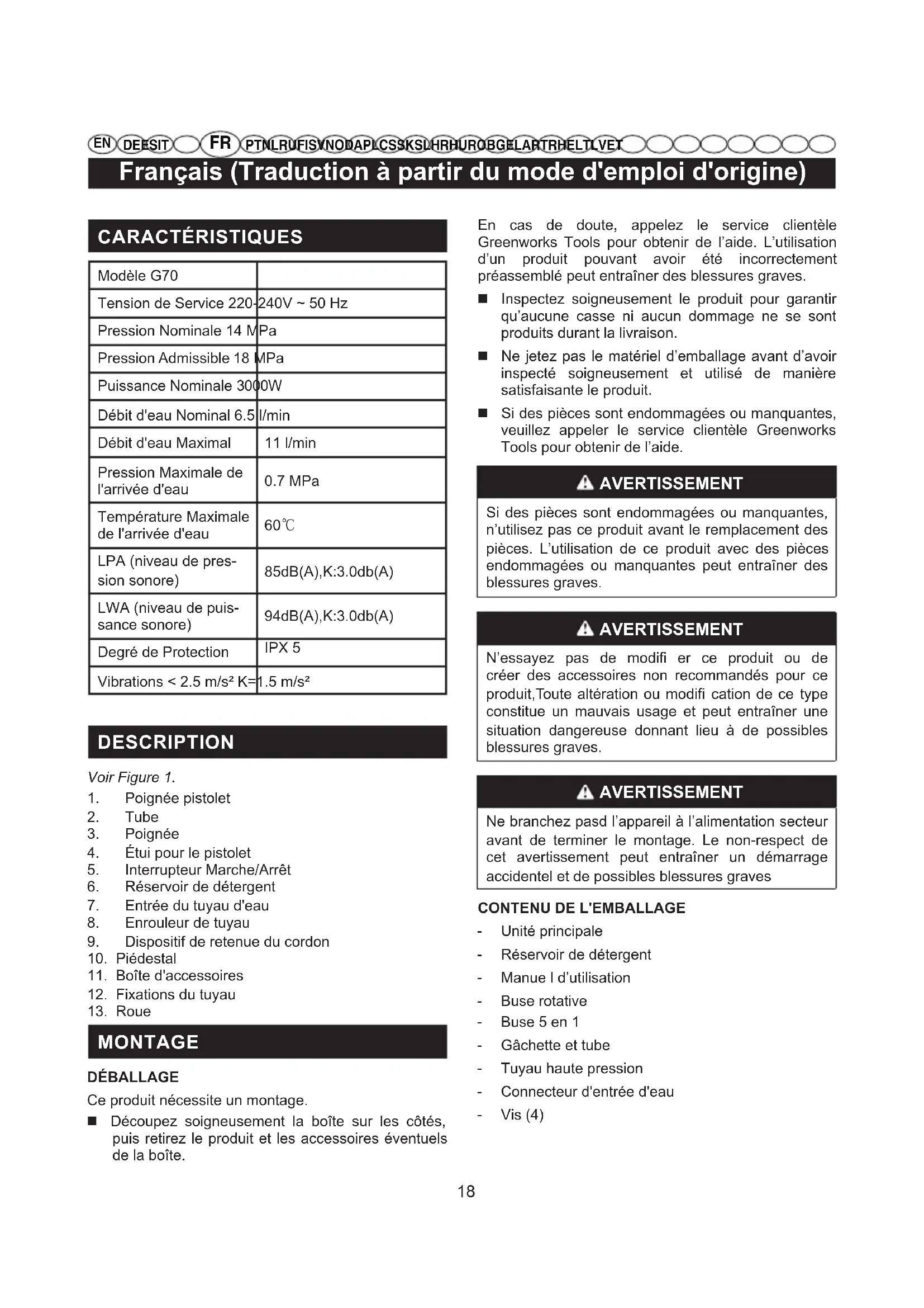 DE ES IT PT NL RU FI SV NO DA PL CS SK SL HR HU RO BG EL AR TR HE LT LV ET Français (Traduction à partir du mode d'emploi d'origine) CARACTÉRISTIQUES Modèle G70 Tension de Service 220-240V ~ 50 Hz Pression Nominale 14 MPa Pression Admissible 18 MPa Puissance Nominale 3000W Débit d'eau Nominal 6.5 l/min Débit d'eau Maximal 11 l/min Pression Maximale de l'arrivée d'eau