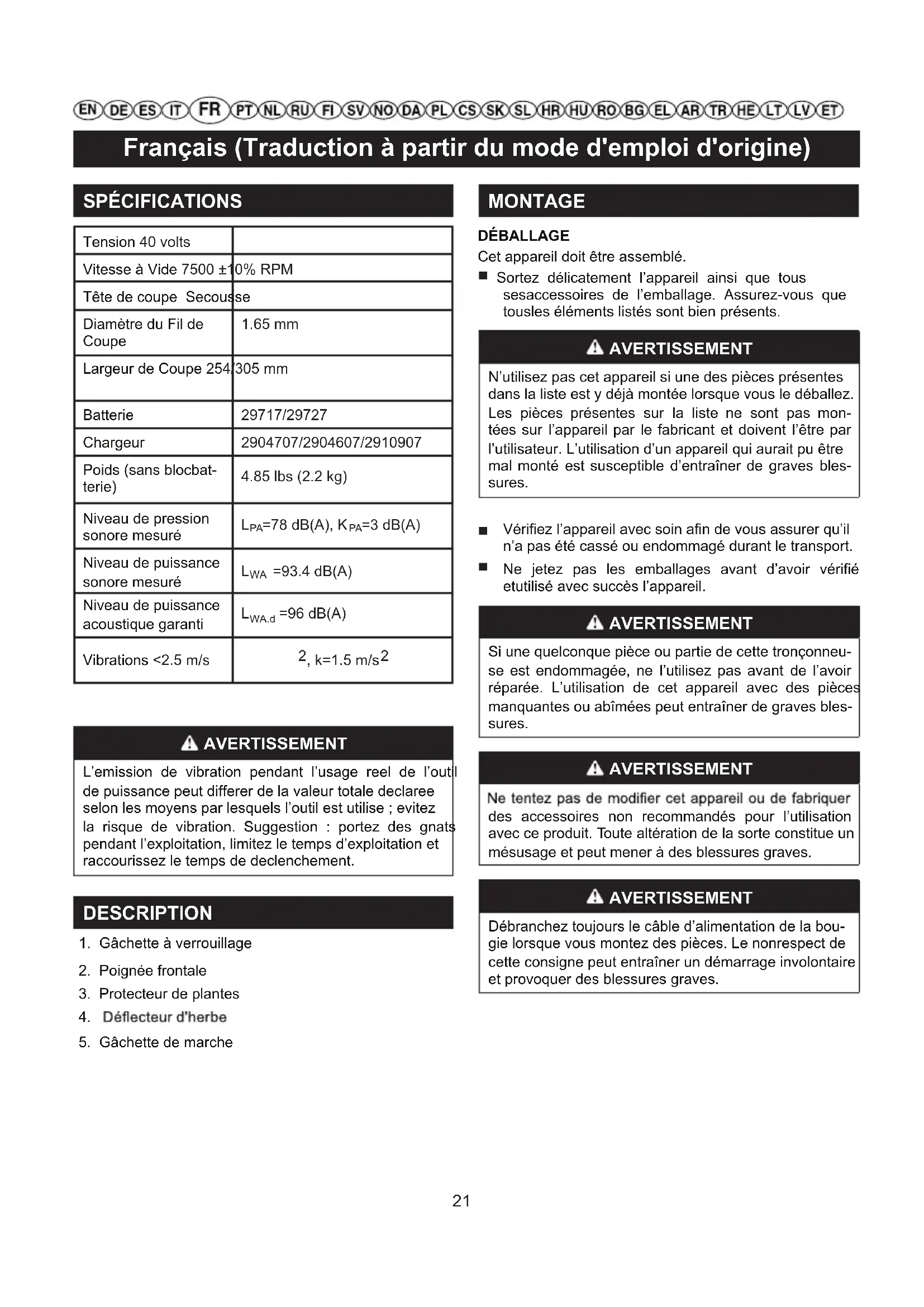 Cf. Figure 2. ■ Le guide-bordure peut limiter la zone de du fil de coupe et réduire ainsi les risqued de dommages causés par le fil rotaif. ■ Pour utiliser le guide-bordures, appuyez sur le guidebordures situé sur la tête de coupe. MONTAGE DE LA POIGNÉE AVANT Cf. Figure 3. AVERTISSEMENT Evitez d’entrer en contact avec la lame. Le nonrespect de cette précaution peut entraîner de graves blessures. ■ Enlever le paquet de batterie. ■ Inversez le taille-haie d’herbes à accéder la tête de taille-haie. ■ Insérez le capot de protection (1) dans les rainures de la tête de coupe. ■ Alignez le trou de vis sur la garde avec le trou de vis sur la tête de taille-haie. ■ Insérez la vis dans la tête de taille-haie, en attachant la garde en position. AVERTISSEMENT Ne laissez pas l’habitude de l’appareil vous rendre de seconde d’inattention pour que se produisent de graves blessures. AVERTISSEMENT Portez toujours un masque de protection oculaire ou des lunettes avec protections latérales lors de l’utilisation d’un outil électrique. Dans le cas contraire, des objets pourraient être projetés vers vos yeux et provoquer de graves blessures. AVERTISSEMENT avec cet appareil. N’utilisez aucun accessoire qui ne soit pas recommandé par le fabricant de ce produit. Il pour- rait en résulter de graves blessures. FIXATION DE LA POIGNÉE AUXILIAIRE Cf. Figure 4. Fixation de la poignée auxiliaire ■ Relâchez les extrémités de la poignée auxiliaire et poussez-la sur l’arbre jusqu’à ce qu’elle s’enclenche dans sa position. ■ Faites pivoter la poignée auxiliaire dans le sens de la flèche et engagez-la dans la position requise.Insert the screw through the holes. ■ Vissez le bouton et serrez-le fermement. RÉGLER LA LONGUEUR DU MANCHE Cf. Figure 5. La longueur du manche peut être réglée à une hauteur appropriée à l’utilisateur. ■ Retirez la batterie. ■ Tenez fermement le manche. ■ Appuyez sur le bouton de verrouillage (1) et maintenez- le dans cette position.. ■ Tirez ou poussez la poignée de contrôle (2) dans la position requise. ■ Relâchez le bouton de verrouillage (1). ■ Déplacez la poignée de contrôle (2) d’avant en arrière jusqu’à ce qu’elle s’encastre. OPERATION Tenez le moteur avec votre main droit à la poignée arrière et votre main gauche à la poignée frontale. Tenez fermement avec les deux mains pendant l’opération. Le moteur doit être tenu à la position confortable avec la poignée arrière à l’hauteur près de la hanche. Toujours opérez le moteur à plein régime. Se les débris s’enroulent sur l’attachement, DECLENCHEZ LA GACHETTE, et enlevez les débris. MISE EN PLACE DU PACK BATTERIE Cf. Figure 6. ■ Insérez le pack batterie dans la tondeuse. Alignez les languettes du pack batterie avec les rainures du logement batterie de la tondeuse. ■ Assurez-vous que les loquets à la base du pack batterie se verrouillent bien et que le pack est bien en place dans la tondeuse avant de commencer le travail. RETRAIT DU PACK BATTERIE Cf. Figure 6. ■ Relâchez la gâchette de marche et la gâchette de blocage pour arrêter le taille-haie. ■ Appuyez sur le bouton d’alimentation pour éteindre le taille-haie. ■ Maintenez enfoncé le loquet à la base du packbatterie. ■ Retirez le pack batterie de la tondeuse. STARTING/STOPPING THE TRIMMER See Figure 6. ■ Pour allumer l’outil, maintenez le bouton de verrouillage de sécurité appuyé (1) et appuyez sur la gâchette (2). 22Français (Traduction à partir du mode d'emploi d'origine) ■ Pour éteindre l’outil, relâchez la gâchette. AVERTISSEMENT Ruido. Es inevitable cierto nivel de ruido procedente de la máquina. Debe tenerse permiso para realizar trabajos con alto nivel de ruido y limitarse a ciertos períodos. Mantenga los períodos de descanso y tenga en cuenta que puede ser necesario restringir las horas de trabajo al mínimo. Para su protección personal y la protección de las personas que trabajan en las inmediaciones, uti- lice protección auditiva adecuada; Vibración. Use siempre guantes de seguridad antivi- bración. La vibración excesiva puede causar síndrome del dedo blanco o síndrome del túnel carpiano. Si nota una sensación desagradable o decoloración de la piel durante el uso de la máquina en sus manos una vez que deje de funcionar. Realice los descansos adecuados. Las personas que utilicen la máquina de forma constan- te y regular deben revisar con frecuencia el estado de sus manos y dedos. AVERTISSEMENT Tout contact avec la tête de coupe de la tondeuse en cours d’utilisation peut entraîner de graves blessures. CONSEILS POUR LA COUPE Cf. Figure 7. ■ Gardez l’appareil incliné vers la zone à couper; cecicorrespond à la zone de coupe optimale. ■ La coupe sera plus efficace si vous déplacez la tondeuse de gauche à droite dans la zone de coupe; elle sera moins efficace si le mouvement se fait de droite à gauche. ■ Coupez à l’aide de l’extrémité du fil de coupe; ne faites pas forcer la tête de coupe dans l’herbe non coupée. ■ Les fils et clôtures accélèrent l’usure du fil, et vont jusqu’à le briser. Les pierres et briques, les margelles, ainsi que le bois peuvent accélérer l’usure du fil. ■ Evitez les arbres et les arbustes. Les écorces, les moulures, les revêtements, et les piquets de clôture peuvent facilement être endommagés par le fil de coupe.