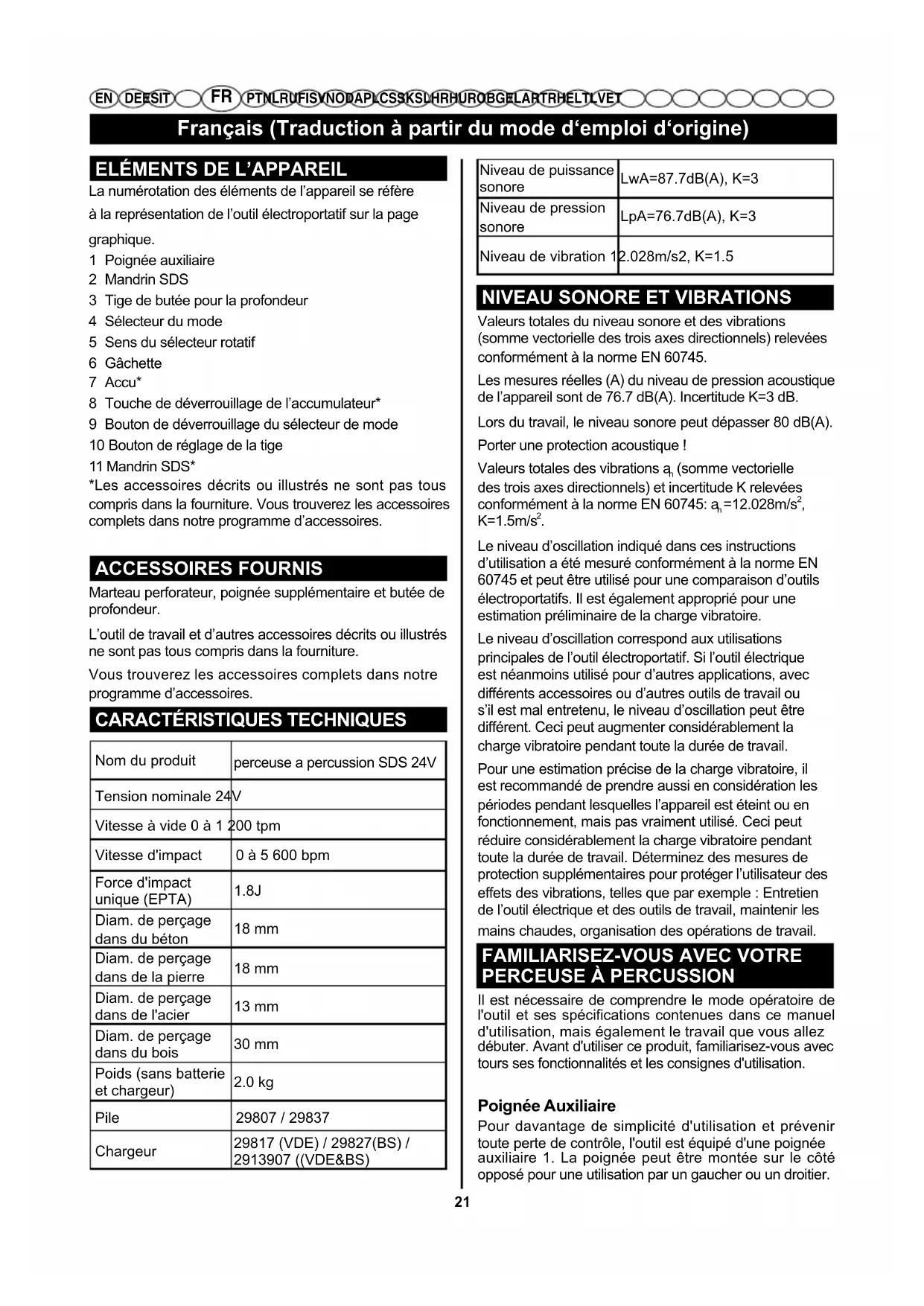 La numérotation des éléments de l’appareil se réfère à la représentation de l’outil électroportatif sur la page graphique. 1 Poignée auxiliaire 2 Mandrin SDS 3 Tige de butée pour la profondeur 4 Sélecteur du mode 5 Sens du sélecteur rotatif 6 Gâchette 7 Accu* 8 Touche de déverrouillage de l’accumulateur* 9 Bouton de déverrouillage du sélecteur de mode 10 Bouton de réglage de la tige 11 Mandrin SDS* *Les accessoires décrits ou illustrés ne sont pas tous compris dans la fourniture. Vous trouverez les accessoires complets dans notre programme d’accessoires. ACCESSOIRES FOURNIS Marteau perforateur, poignée supplémentaire et butée de profondeur. L’outil de travail et d’autres accessoires décrits ou illustrés ne sont pas tous compris dans la fourniture. Vous trouverez les accessoires complets dans notre programme d’accessoires.