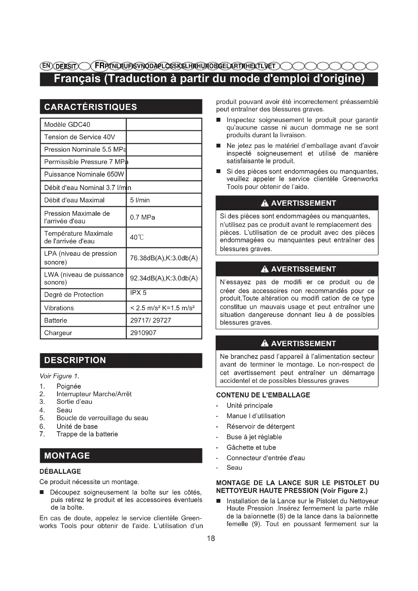 DE ES IT FR PT NL RU FI SV NO DA PL CS SK SL HR HU RO BG EL AR TR HE LT LV ET Français (Traduction à partir du mode d'emploi d'origine) CARACTÉRISTIQUES Modèle GDC40 Tension de Service 40V Pression Nominale 5.5 MPa Permissible Pressure 7 MPa Puissance Nominale 650W Débit d'eau Nominal 3.7 l/min Débit d'eau Maximal 5 l/min Pression Maximale de l'arrivée d'eau