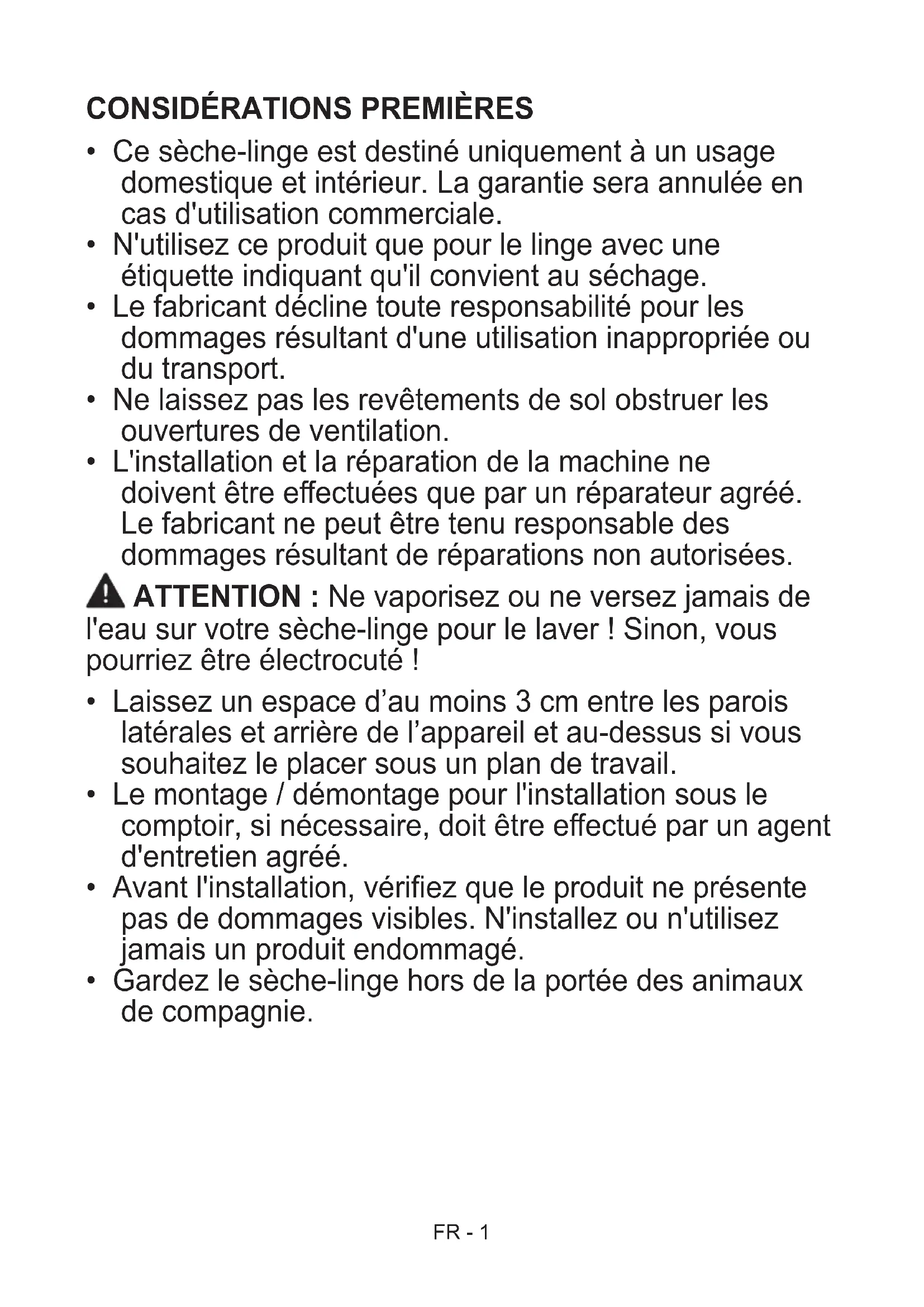 - Ce sèche-linge est destiné uniquement à un usage domestique et interieur. La garantie sera annulée en cas d'utilisation commerciale.