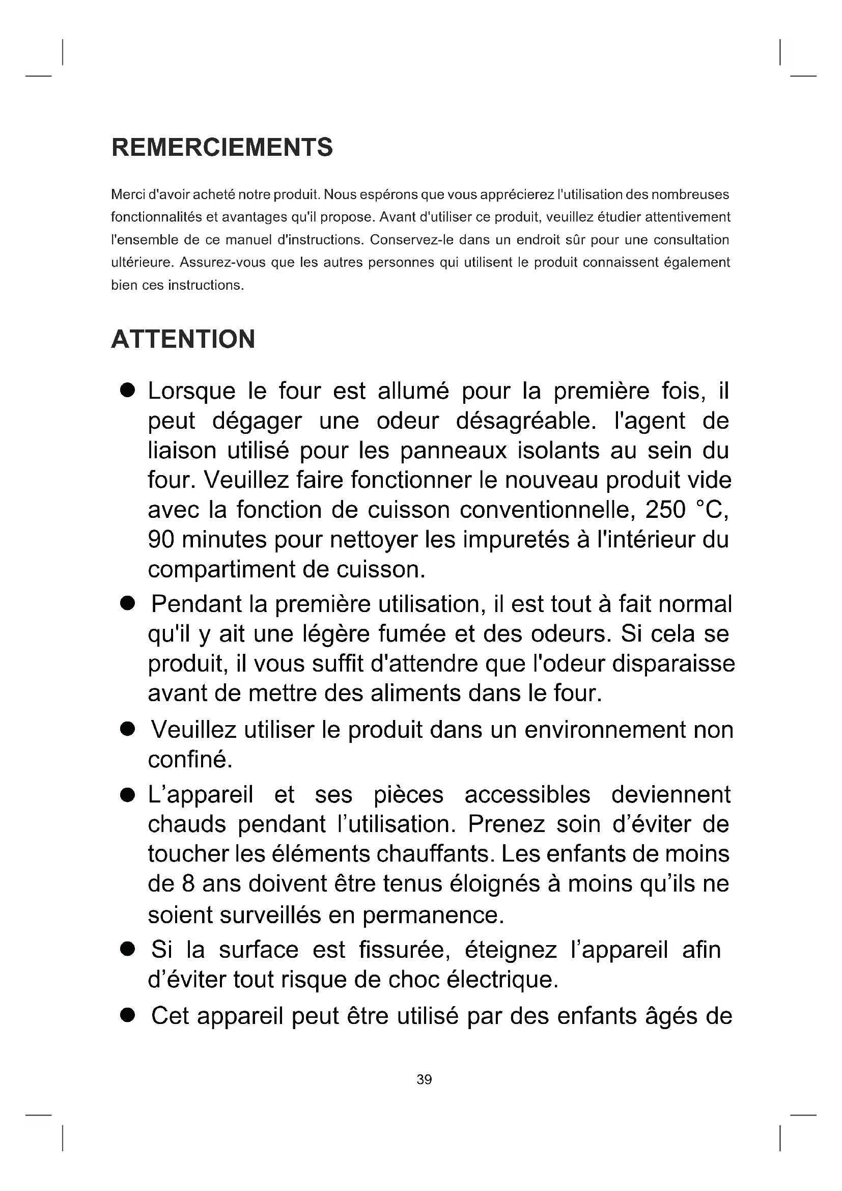 Lorsque le four est allumé pour la première fois, il peut dégager une odeur désagréable. l'agent de liaison utilisé pour les panneaux isolants au sein du four. Veuillez faire fonctionner le nouveau produit vide avec la fonction de cuisson conventionnelle, 250 °C, 90 minutes pour nettoyer les impuretés à l'intérieur du compartiment de cuisson. Pendant la première utilisation, il est tout à fait normal qu'il y ait une légère fumée et des odeurs. Si cela se produit, il vous suft d'attendre que l'odeur disparaisse avant de mettre des aliments dans le four. Veuillez utiliser le produit dans un environnement non conné.