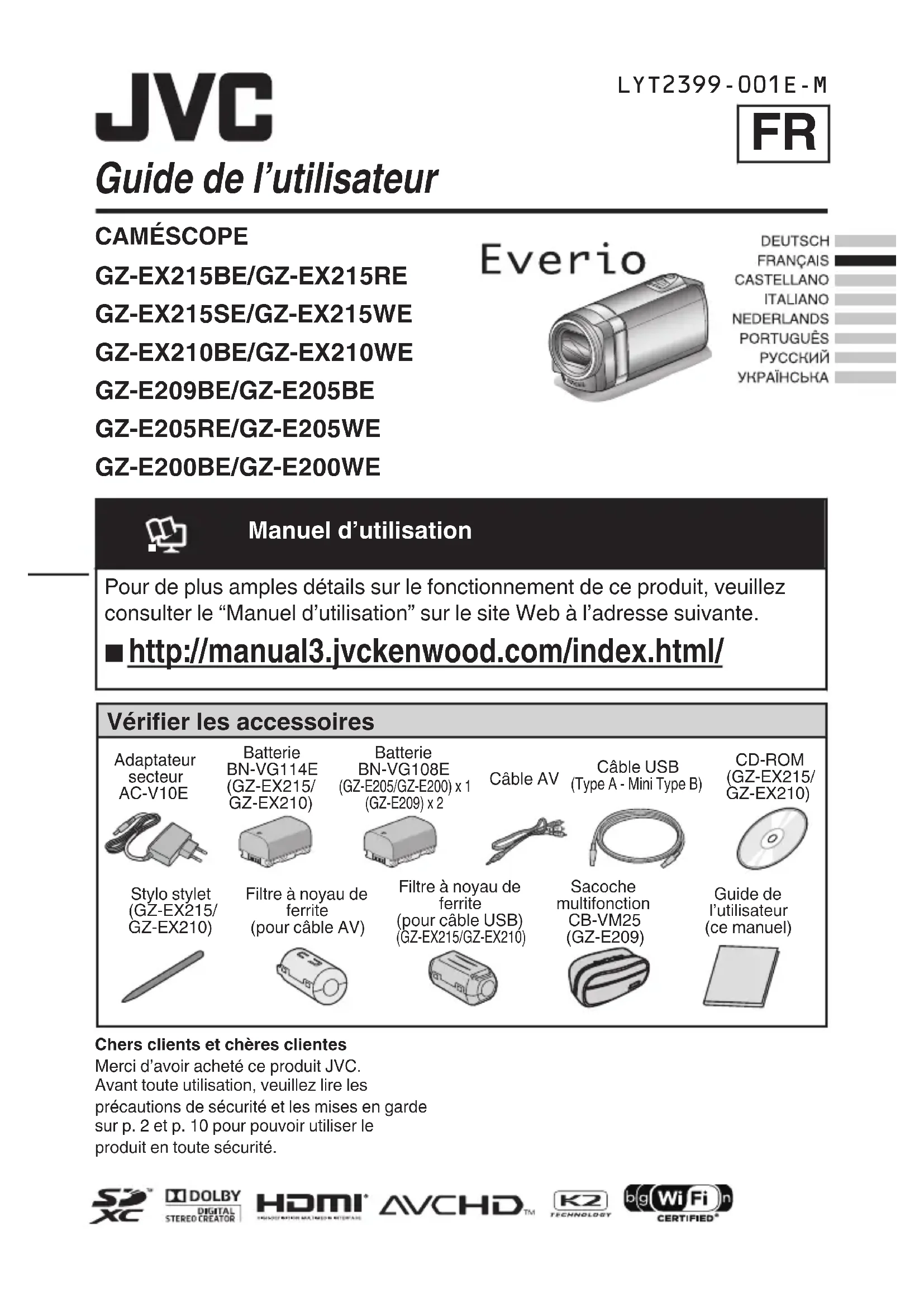 Guide de l’utilisateur(ce manuel)Filtre à noyau de ferrite(pour câble AV)Stylo stylet(GZ-EX215/GZ-EX210)CD-ROM(GZ-EX215/GZ-EX210)Câble AVCâble USB(Type A - Mini Type B)BatterieBN-VG108E(GZ-E205/GZ-E200) x 1(GZ-E209) x 2BatterieBN-VG114E(GZ-EX215/GZ-EX210)Adaptateur secteur AC-V10EVérifier les accessoiresFiltre à noyau de ferrite(pour câble USB)(GZ-EX215/GZ-EX210)Sacoche multifonctionCB-VM25(GZ-E209)