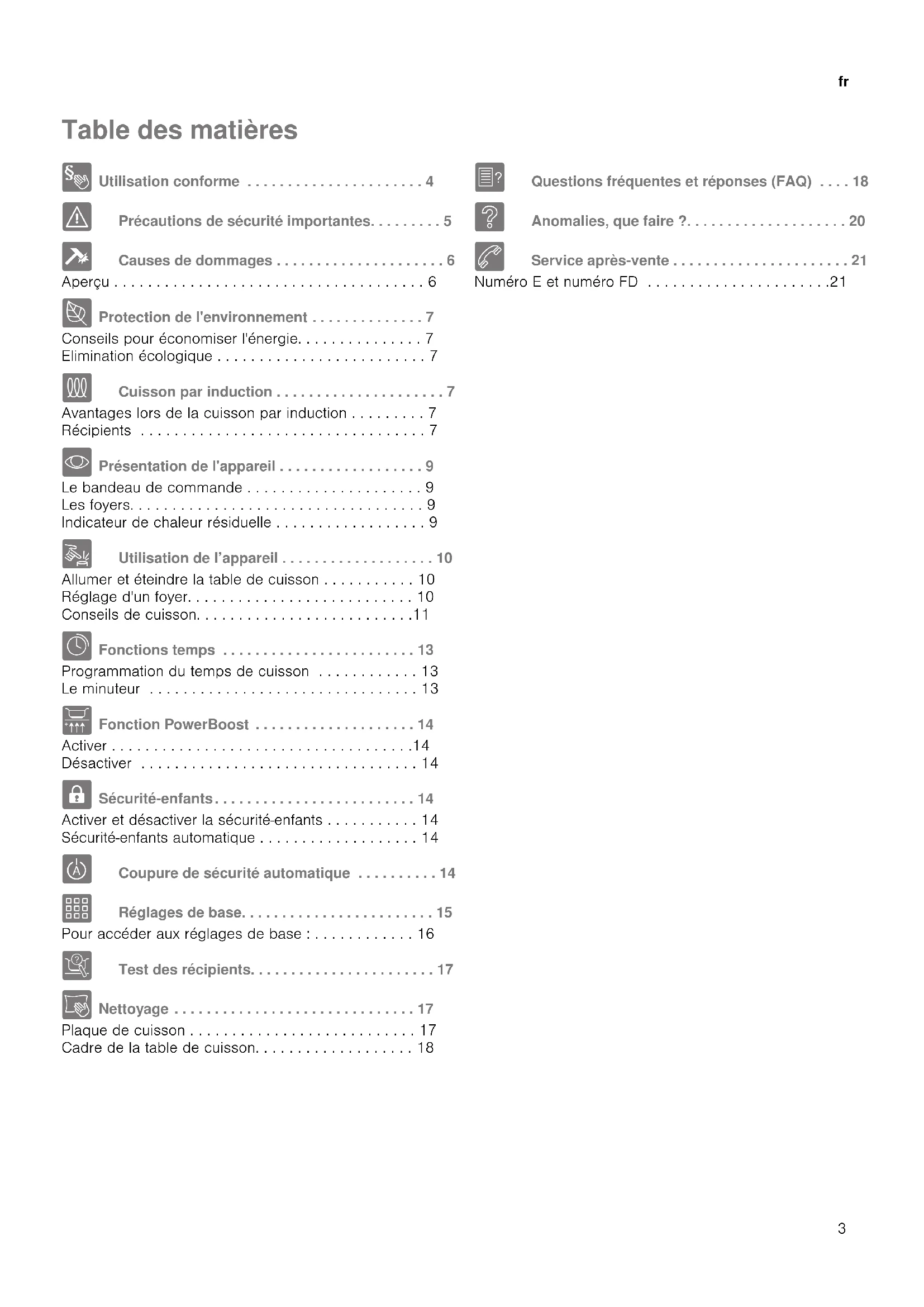 - Présentation de l'appareil . . . . . . . . . . . . . . . . . . 9 Le bandeau de commande . . . . . . . . . . . . . . . . . . . . . 9 Les foyers. . . . . . . . . . . . . . . . . . . . . . . . . . . . . . . . . . . 9 Indicateur de chaleur résiduelle . . . . . . . . . . . . . . . . . . 9 1 Utilisation de l’appareil . . . . . . . . . . . . . . . . . . . 10 Allumer et éteindre la table de cuisson . . . . . . . . . . . 10 Réglage d'un foyer. . . . . . . . . . . . . . . . . . . . . . . . . . . 10 Conseils de cuisson. . . . . . . . . . . . . . . . . . . . . . . . . .11 O Fonctions temps . . . . . . . . . . . . . . . . . . . . . . . . 13 Programmation du temps de cuisson . . . . . . . . . . . . 13 Le minuteur . . . . . . . . . . . . . . . . . . . . . . . . . . . . . . . . 13 v Fonction PowerBoost . . . . . . . . . . . . . . . . . . . . 14 Activer . . . . . . . . . . . . . . . . . . . . . . . . . . . . . . . . . . . .14 Désactiver . . . . . . . . . . . . . . . . . . . . . . . . . . . . . . . . . 14 A Sécurité-enfants. . . . . . . . . . . . . . . . . . . . . . . . . 14 Activer et désactiver la sécurité-enfants . . . . . . . . . . . 14 Sécurité-enfants automatique . . . . . . . . . . . . . . . . . . . 14 b Coupure de sécurité automatique . . . . . . . . . . 14 Q Réglages de base. . . . . . . . . . . . . . . . . . . . . . . . 15 Pour accéder aux réglages de base : . . . . . . . . . . . . 16 t Test des récipients. . . . . . . . . . . . . . . . . . . . . . . 17 D Nettoyage . . . . . . . . . . . . . . . . . . . . . . . . . . . . . . 17 Plaque de cuisson . . . . . . . . . . . . . . . . . . . . . . . . . . . 17 Cadre de la table de cuisson. . . . . . . . . . . . . . . . . . . 18 { Questions fréquentes et réponses (FAQ) . . . . 18 3 Anomalies, que faire ?. . . . . . . . . . . . . . . . . . . . 20 4 Service après-vente . . . . . . . . . . . . . . . . . . . . . . 21 Numéro E et numéro FD . . . . . . . . . . . . . . . . . . . . . .21fr Utilisation conforme