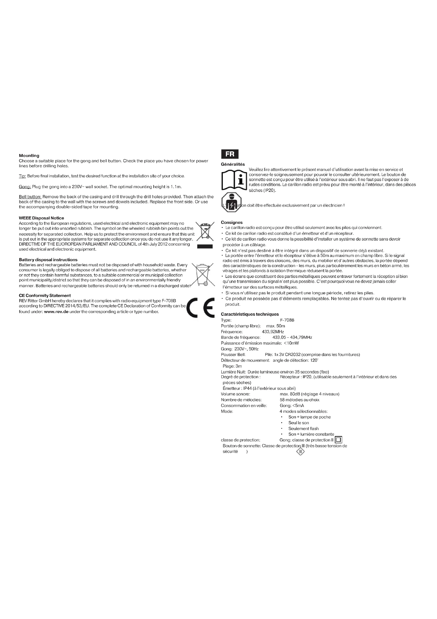 Par la présente, la société REV Ritter GmbH déclare que le type de système radio F-708B répond aux exigences de la DIRECTIVE 2014/53/EU. Vous trouverez une déclaration de conformité CE complète à l'adresse : www.rev.de au numéro de type ou d'article correspondant.