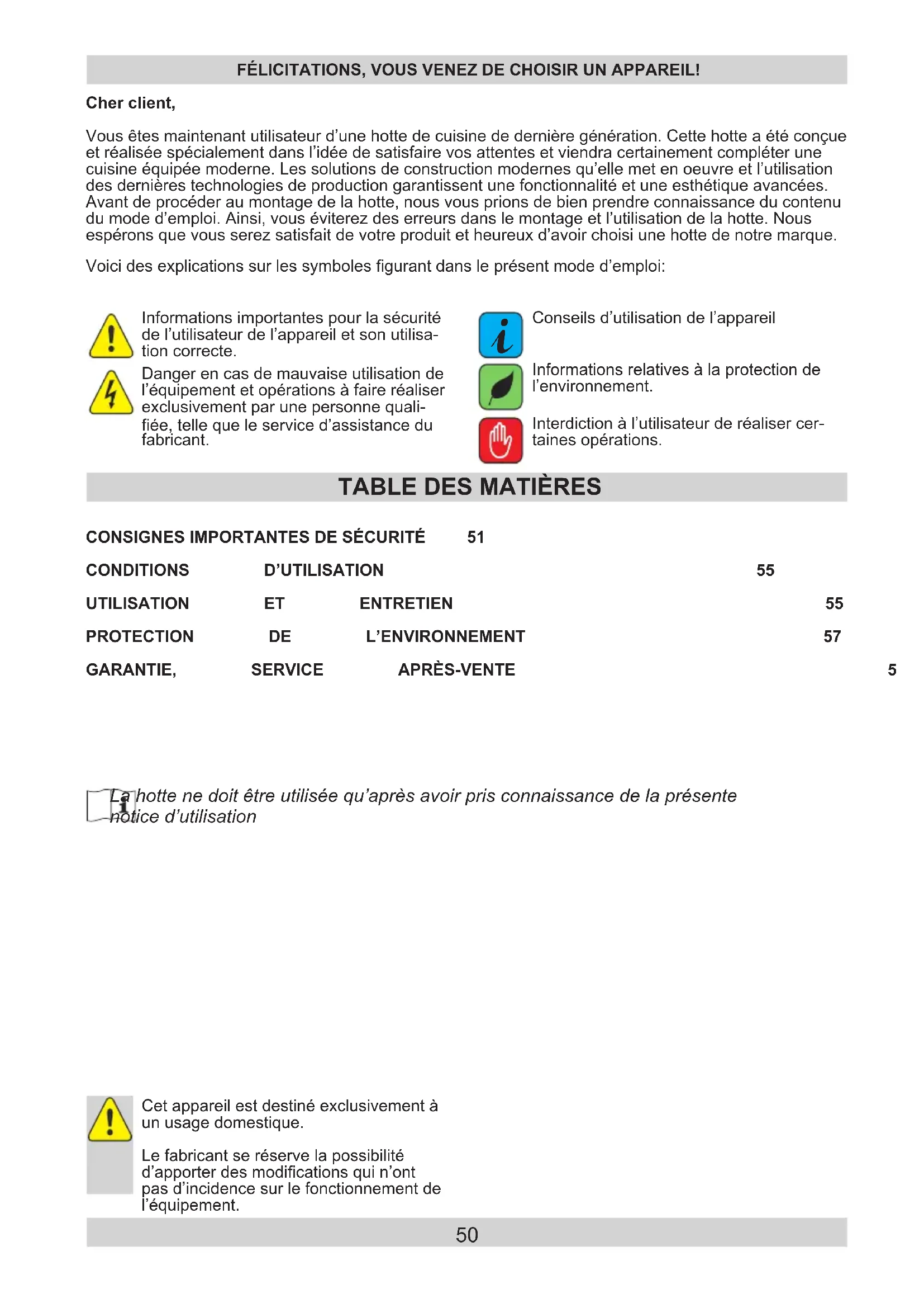 Vous êtes maintenant utilisateur d'une hotte de cuisine de dernière génération. Cette hotte a été conçue et réalisée spécialement dans l'idée de satisfaire vos attentes et viendra certainement compléter une cuisine équipée moderne. Les solutions de construction modernes qu'elle met en oeuvre et l'utilisation des dernières technologies de production garantissent une fonctionnalité et une esthétique avancées. Avant de procéder au montage de la hotte, nous vous prions de bien prendre connaissance du contenu du mode d'emploi. Ainsi, vous éviterez des erreurs dans le montage et l'utilisation de la hotte. Nous espérons que vous serez satisfait de votre produit et heureux d'avoir choisi une hotte de notre marque.