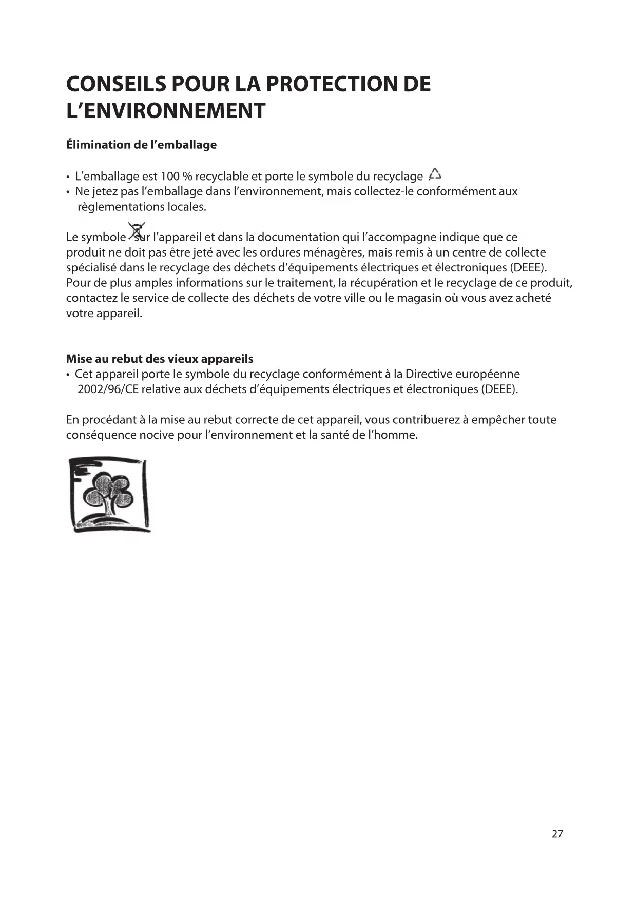 - Cet appareil porte le symbole du recyclage conformément à la Directive européenne 2002/96/CE relative aux déchets d’équipements électriques et électroniques (DEEE). En procédant à la mise au rebut correcte de cet appareil, vous contribuerez à empêcher toute conséquence nocive pour l’environnement et la santé de l’homme.28