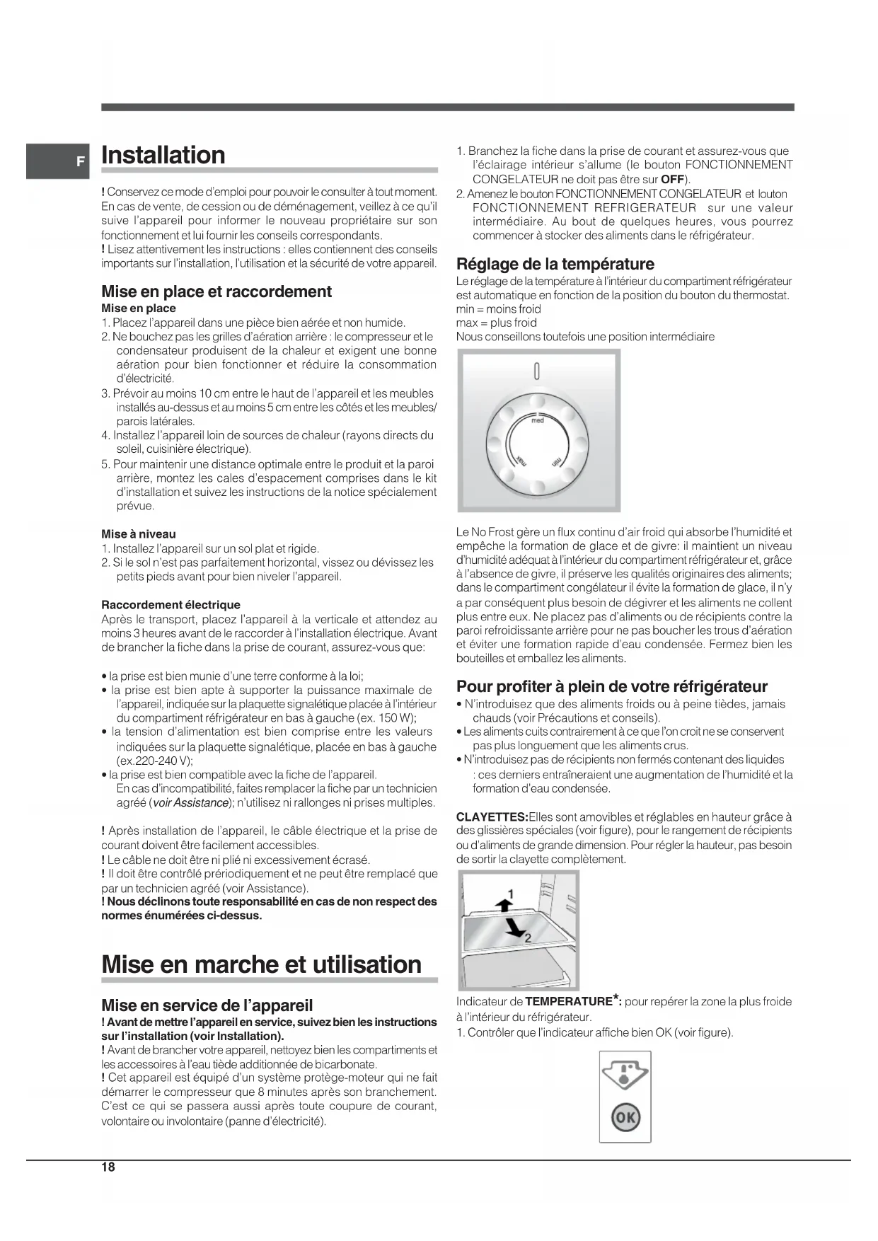 FONCTIONNEMENT REFRIGERATEUR sur une valeur intermédiaire. Au bout de quelques heures, vous pourrez commencer à stocker des aliments dans le réfrigérateur. Réglage de la température Le réglage de la température à l’intérieur du compartiment réfrigérateur est automatique en fonction de la position du bouton du thermostat. min = moins froid max = plus froid Nous conseillons toutefois une position intermédiaire Le No Frost gère un flux continu d’air froid qui absorbe l’humidité et empêche la formation de glace et de givre: il maintient un niveau d’humidité adéquat à l’intérieur du compartiment réfrigérateur et, grâce à l’absence de givre, il préserve les qualités originaires des aliments; dans le compartiment congélateur il évite la formation de glace, il n’y a par conséquent plus besoin de dégivrer et les aliments ne collent plus entre eux.