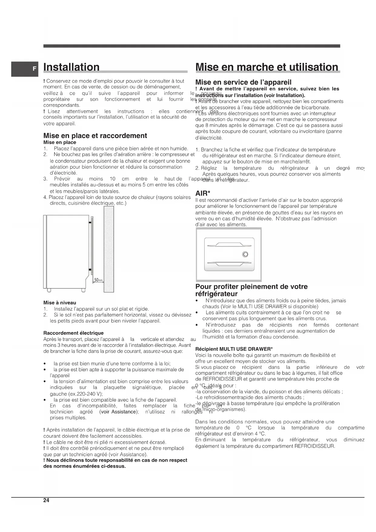 - lapriseestbiencompatibleaveclafichedel’appareil. En cas d’incompatibilité, faites remplacer la fiche par un technicien agréé (voir Assistance); n’utilisez ni rallonges ni prisesmultiples. !Aprèsinstallationdel’appareil,lecâbleélectriqueetlaprisede courantdoiventêtrefacilementaccessibles. !Lecâblenedoitêtrenipliéniexcessivementécrasé. ! Ildoitêtrecontrôléprériodiquementetnepeutêtreremplacé queparuntechnicienagréé(voirAssistance). ! Nous déclinons toute responsabilité en cas de non respect des normes énumérées ci-dessus. Mise en marche et utilisation Mise en service de l’appareil ! Avant de mettre l’appareil en service, suivez bien les instructions sur l’installation (voir Installation). !Avantdebranchervotreappareil,nettoyezbienlescompartiments etlesaccessoiresàl’eautièdeadditionnéedebicarbonate. !Lesversionsélectroniquessontfourniesavecuninterrupteur deprotectiondumoteurquinemetenmarchelecompresseur que8minutesaprèsledémarrage.C’estcequisepasseraaussi aprèstoutecoupuredecourant,volontaireouinvolontaire(panne d’électricité. 1.Branchezlaficheetvérifiezquel’indicateurdetempérature duréfrigérateurestenmarche.Sil’indicateurdemeureéteint, appuyezsurleboutondemiseenmarche/arrêt. 2.Réglez la température du réfrigérateur à un degré moyen. Aprèsquelquesheures,vouspourrezconservervosaliments dansleréfrigérateur. AIR* Ilestrecommandéd’activerl’arrivéed’airsurleboutonapproprié pouraméliorerlefonctionnementdel’appareilpartempérature ambianteélevée,enprésencedegouttesd’eausurlesrayonsen verreouencasd’humiditéélevée.N’obstruezpasl’admission d’airaveclesaliments. Pour profiter pleinement de votre réfrigérateur