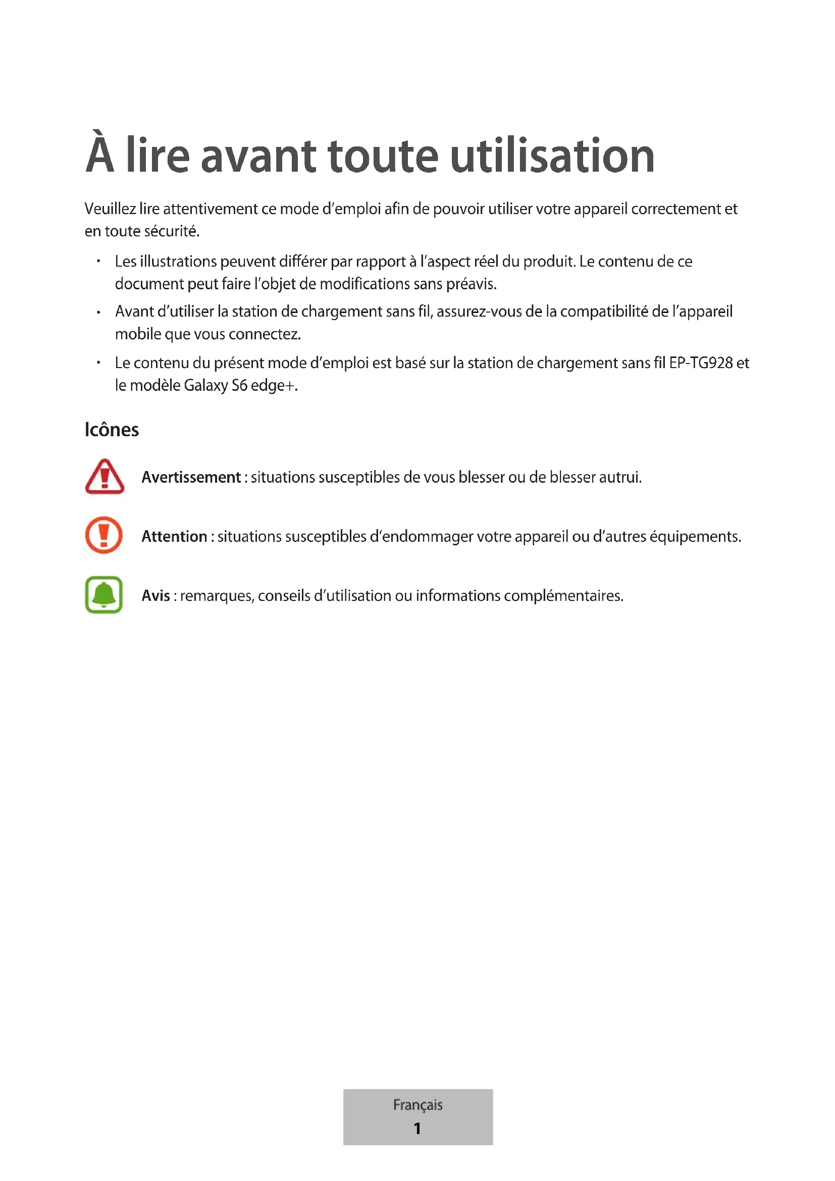 Le contenu du présent guide correspond au bloc de recharge sans fil EP-TG928 et au modèle Galaxy S6 edge+. Liste des icônes