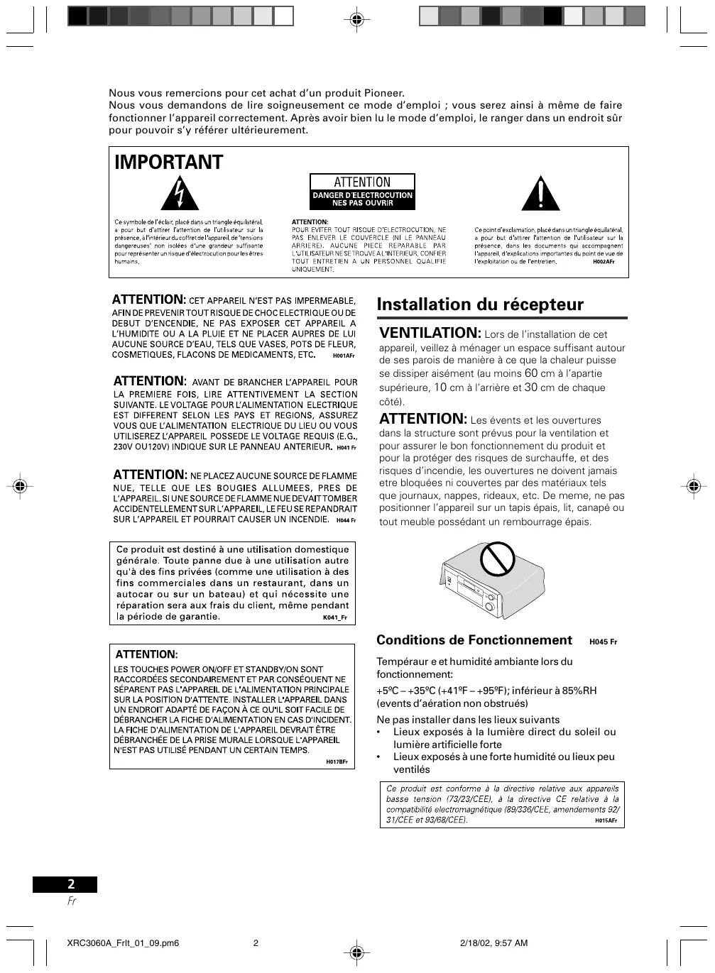 2/18/02, 9:56 AM Nous vous remercions pour cet achat d’un produit Pioneer. Nous vous demandons de lire soigneusement ce mode d’emploi ; vous serez ainsi à même de faire fonctionner l’appareil correctement. Après avoir bien lu le mode d’emploi, le ranger dans un endroit sûr pour pouvoir s’y référer ultérieurement. Installation du récepteur VENTILATION: Lors de l’installation de cet appareil, veillez à ménager un espace suffisant autour de ses parois de manière à ce que la chaleur puisse se dissiper aisément (au moins 60 cm à l’apartie supérieure, 10 cm à l’arrière et 30 cm de chaque côté). ATTENTION: Les évents et les ouvertures dans la structure sont prévus pour la ventilation et pour assurer le bon fonctionnement du produit et pour la protéger des risques de surchauffe, et des risques d’incendie, les ouvertures ne doivent jamais etre bloquées ni couvertes par des matériaux tels que journaux, nappes, rideaux, etc. De meme, ne pas positionner l’appareil sur un tapis épais, lit, canapé ou tout meuble possédant un rembourrage épais. Conditions de Fonctionnement H045 Fr Tempéraur e et humidité ambiante lors du fonctionnement: +5ºC – +35ºC (+41ºF – +95ºF); inférieur à 85%RH (events d’aération non obstrués) Ne pas installer dans les lieux suivants
