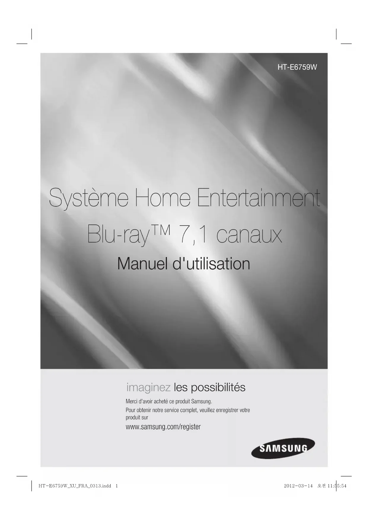 reţea, tarif normal www.samsung.com Serbia 0700 Samsung (0700 726 7864) www.samsung.com Slovakia 0800-SAMSUNG (726-7864) www.samsung.com Spain 902-1-SAMSUNG (902 172 678) www.samsung.com Sweden 0771 726 7864 (SAMSUNG) www.samsung.com Switzerland 0848-SAMSUNG (7267864, CHF 0.08/min) www.samsung.com/ch www.samsung.com/ ch_fr/(French) U.K 0330 SAMSUNG (7267864) www.samsung.com Eire 0818 717100 www.samsung.com Lithuania 8-800-77777 www.samsung.com Latvia 8000-7267 www.samsung.com Estonia 800-7267 www.samsung.com Contatta SAMSUNG WORLD WIDE Se avete commenti o domande sui prodotti Samsung, contattate il Servizio Clienti Samsung. HT-E6759W_XU_ITA_0313.indd 69HT-E6759W_XU_ITA_0313.indd 69 2012-03-14 오후 1:19:282012-03-14 오후 1:19:28imaginez les possibilités Merci d'avoir acheté ce produit Samsung.Pour obtenir notre service complet, veuillez enregistrer votre produit sur www.samsung.com/register Système Home Entertainment Blu-ray™ 7,1 canaux Manuel d'utilisation HT-E6759W HT-E6759W_XU_FRA_0313.indd 1HT-E6759W_XU_FRA_0313.indd 1 2012-03-14 오전 11:55:542012-03-14 오전 11:55:54| 2 Français Consignes de Sécurité Avertissement POUR RÉDUIRE LES RISQUES D’ÉLECTROCUTION, NE RETIREZ JAMAIS LE CAPOT (NI L’ARRIÈRE).LES PIÈCES DE CE PRODUIT NE SONT PAS RÉPARABLES PAR L’UTILISATEUR. VEUILLEZ CONTACTER UN TECHNICIEN QUALIFIÉ POUR TOUTE RÉPARATION. ATTENTION RISQUE D’ÉLECTROCUTIONNE PAS OUVRIRCe symbole indique la présence d’une tension dangereuse dans l’appareil, présentant un risque d’électrocution ou de blessures.ATTENTION : POUR ÉVITER TOUT RISQUE D’ÉLECTROCUTION, LA BROCHE LA PLUS LARGE DE LA FICHE DOIT ÊTRE TOTALEMENT INSÉRÉE DANS LE TROU PLUS LARGE.Ce symbole indique les directives importantes qui accompagnent le produit.AVERTISSEMENT • Afin de réduire tout risque d’incendie ou d’électrocution, n’exposez jamais cet appareil à la pluie ou à l’humidité.ATTENTION• Évitez toute projection d’eau sur l’appareil et ne posez jamais d’objet contenant un liquide dessus (ex : un vase).• La fiche permet de débrancher l’appareil et doit toujours être facilement accessible.• Cet appareil doit toujours être branché à une prise de courant alternatif reliée à la terre.• Pour débrancher l'appareil, il convient de retirer la fiche de la prise murale, il faut donc que cette dernière soit facilement accessible.
