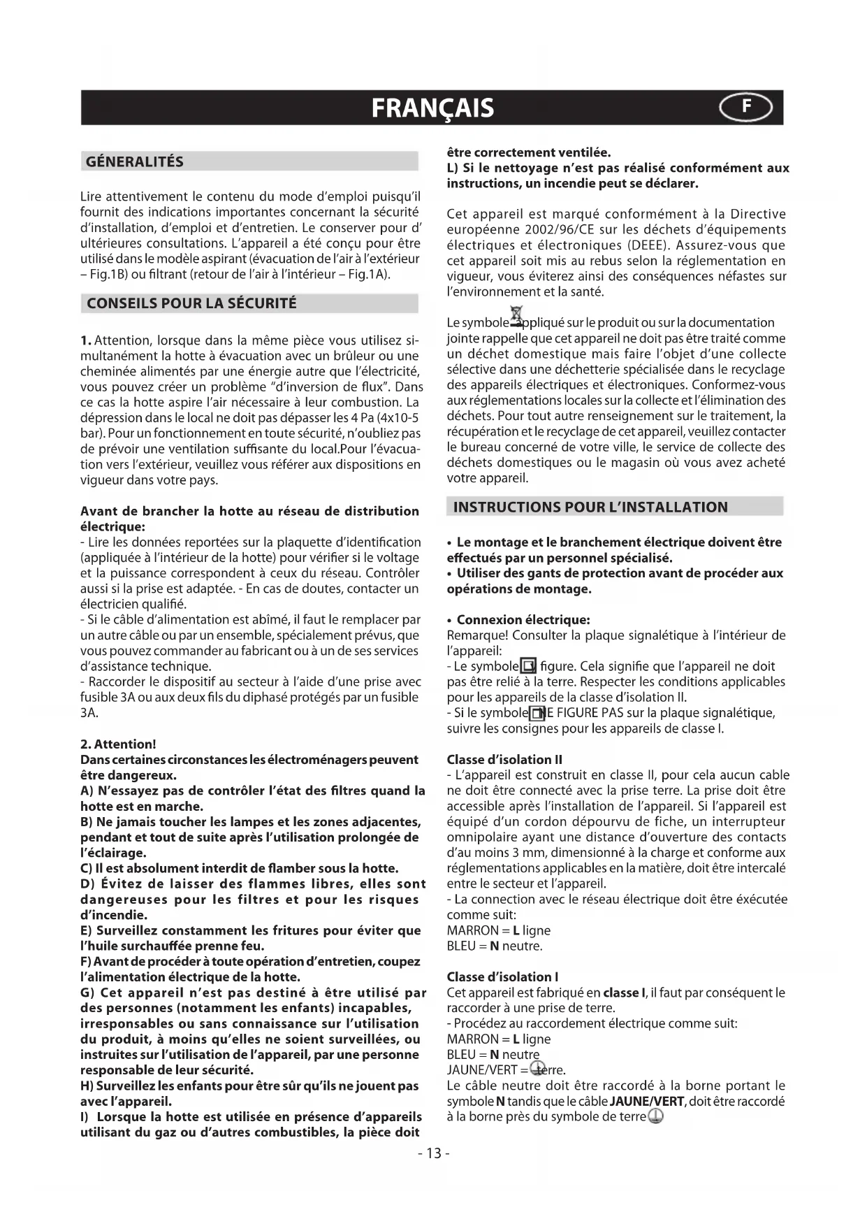 - Connexionélectrique: Remarque! Consulter la plaque signalétique à l’intérieur de l’appareil: - Le symbole y gure. Cela signie que l’appareil ne doit pas être relié à la terre. Respecter les conditions applicables pour les appareils de la classe d’isolation II. - Si le symbole NE FIGURE PAS sur la plaque signalétique, suivre les consignes pour les appareils de classe I. Classe d’isolation II - L’appareil est construit en classe II, pour cela aucun cable ne doit être connecté avec la prise terre. La prise doit être accessible après l’installation de l’appareil. Si l’appareil est équipé d’un cordon dépourvu de fiche, un interrupteur omnipolaire ayant une distance d’ouverture des contacts d’au moins 3 mm, dimensionné à la charge et conforme aux réglementations applicables en la matière, doit être intercalé entre le secteur et l’appareil. - La connection avec le réseau électrique doit être éxécutée comme suit: MARRON = L ligne BLEU = N neutre. Classe d’isolation I Cet appareil est fabriqué en classe I, il faut par conséquent le raccorder à une prise de terre. - Procédez au raccordement électrique comme suit: MARRON = L ligne BLEU = N neutre JAUNE/VERT = terre. Le câble neutre doit être raccordé à la borne portant le symbole N tandis que le câble JAUNE/VERT, doit être raccordé à la borne près du symbole de terre . FRANÇAIS