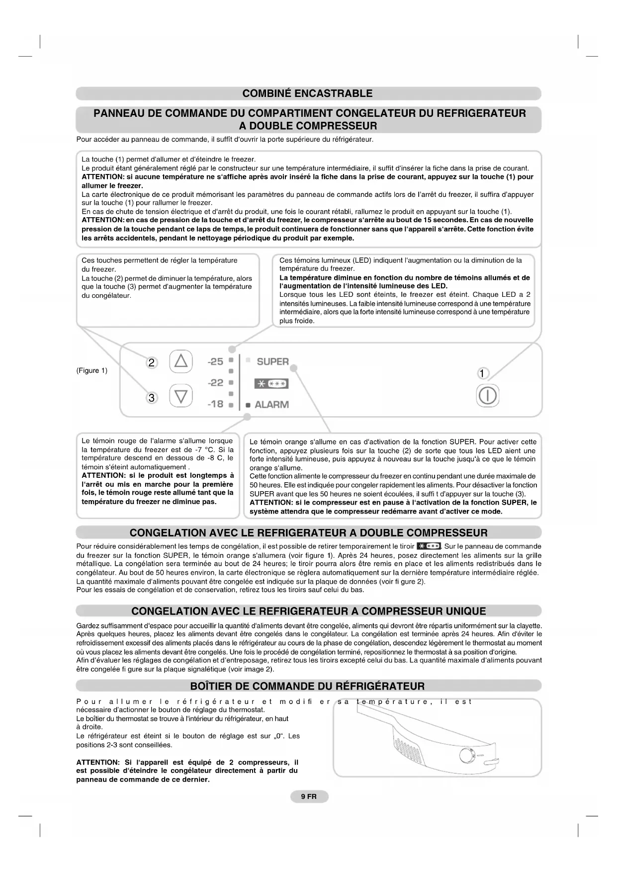 CONGELATION AVEC LE REFRIGERATEUR A DOUBLE COMPRESSEUR Pour réduire considérablement les temps de congélation, il est possible de retirer temporairement le tiroir . Sur le panneau de commande du freezer sur la fonction SUPER, le témoin orange s‘allumera (voir fi gure 1). Après 24 heures, posez directement les aliments sur la grille métallique. La congélation sera terminée au bout de 24 heures; le tiroir pourra alors être remis en place et les aliments redistribués dans le congélateur. Au bout de 50 heures environ, la carte électronique se règlera automatiquement sur la dernière température intermédiaire réglée. La quantité maximale d‘aliments pouvant être congelée est indiquée sur la plaque de données (voir fi gure 2). Pour les essais de congélation et de conservation, retirez tous les tiroirs sauf celui du bas. BOÎTIER DE COMMANDE DU RÉFRIGÉRATEUR Pour allumer le réfrigérateur et modifi er sa température, il est nécessaire d’actionner le bouton de réglage du thermostat. Le boîtier du thermostat se trouve à l‘intérieur du réfrigérateur, en haut à droite. Le réfrigérateur est éteint si le bouton de réglage est sur „0“. Les positions 2-3 sont conseillées. ATTENTION: Si l‘appareil est équipé de 2 compresseurs, il est possible d‘éteindre le congélateur directement à partir du panneau de commande de ce dernier. Ces touches permettent de régler la température du freezer. La touche (2) permet de diminuer la température, alors que la touche (3) permet d’augmenter la température du congélateur. Le témoin rouge de l‘alarme s‘allume lorsque la température du freezer est de -7 °C. Si la température descend en dessous de -8 C, le témoin s‘éteint automatiquement . ATTENTION: si le produit est longtemps à l‘arrêt ou mis en marche pour la première fois, le témoin rouge reste allumé tant que la température du freezer ne diminue pas. Le témoin orange s‘allume en cas d‘activation de la fonction SUPER. Pour activer cette fonction, appuyez plusieurs fois sur la touche (2) de sorte que tous les LED aient une forte intensité lumineuse, puis appuyez à nouveau sur la touche jusqu‘à ce que le témoin orange s‘allume. Cette fonction alimente le compresseur du freezer en continu pendant une durée maximale de 50 heures. Elle est indiquée pour congeler rapidement les aliments. Pour désactiver la fonction SUPER avant que les 50 heures ne soient écoulées, il suffi t d’appuyer sur la touche (3). ATTENTION: si le compresseur est en pause à l‘activation de la fonction SUPER, le système attendra que le compresseur redémarre avant d’activer ce mode. 9 FR Ces témoins lumineux (LED) indiquent l‘augmentation ou la diminution de la température du freezer. La température diminue en fonction du nombre de témoins allumés et de l‘augmentation de l‘intensité lumineuse des LED. Lorsque tous les LED sont éteints, le freezer est éteint. Chaque LED a 2 intensités lumineuses. La faible intensité lumineuse correspond à une température intermédiaire, alors que la forte intensité lumineuse correspond à une température plus froide. La touche (1) permet d‘allumer et d‘éteindre le freezer. Le produit étant généralement réglé par le constructeur sur une température intermédiaire, il suffi t d‘insérer la fi che dans la prise de courant. ATTENTION: si aucune température ne s‘affi che après avoir inséré la fi che dans la prise de courant, appuyez sur la touche (1) pour allumer le freezer. La carte électronique de ce produit mémorisant les paramètres du panneau de commande actifs lors de I’arrêt du freezer, il suffi ra d’appuyer sur la touche (1) pour rallumer le freezer. En cas de chute de tension électrique et d‘arrêt du produit, une fois le courant rétabli, rallumez le produit en appuyant sur la touche (1). ATTENTION: en cas de pression de la touche et d‘arrêt du freezer, le compresseur s‘arrête au bout de 15 secondes. En cas de nouvelle pression de la touche pendant ce laps de temps, le produit continuera de fonctionner sans que l‘appareil s‘arrête. Cette fonction évite les arrêts accidentels, pendant le nettoyage périodique du produit par exemple. COMBINÉ ENCASTRABLE CONGELATION AVEC LE REFRIGERATEUR A COMPRESSEUR UNIQUE Gardez suffi samment d‘espace pour accueillir la quantité d‘aliments devant être congelée, aliments qui devront être répartis uniformément sur la clayette. Après quelques heures, placez les aliments devant être congelés dans le congélateur. La congélation est terminée après 24 heures. Afi n d‘éviter le refroidissement excessif des aliments placés dans le réfrigérateur au cours de la phase de congélation, descendez légèrement le thermostat au moment où vous placez les aliments devant être congelés. Une fois le procédé de congélation terminé, repositionnez le thermostat à sa position d‘origine. Afi n d‘évaluer les réglages de congélation et d‘entreposage, retirez tous les tiroirs excepté celui du bas. La quantité maximale d‘aliments pouvant être congelée fi gure sur la plaque signalétique (voir image 2).DÉGIVRAGE (Figure 2) Le dégivrage du refrigérateur se fait automatiquement durant la pause du compresseur. La présence d’une fi ne couche de givre ou de gouttes d’eau durant le fonctionnement de I’appareil est normale. Il est important que la conduite d‘évacuation sort toujours propre et d‘éviter que les aliments touchent la paroi du compartiment. Il est conseillé de dégivrer le congélateur lorsque la couche de givre dépasse 3 mm. d‘épaisseur. N.B. Plaque de données de l‘appareil, à communiquer à l’assistance technique en cas de panne. Important: si la température ambiante est très élevée, l‘appareil pourrait fonctionner en continu, provoquant la formation anormale de givre sur la paroi de fond du réfrigérateur. Dans ce cas, il est nécessaire de régler le t