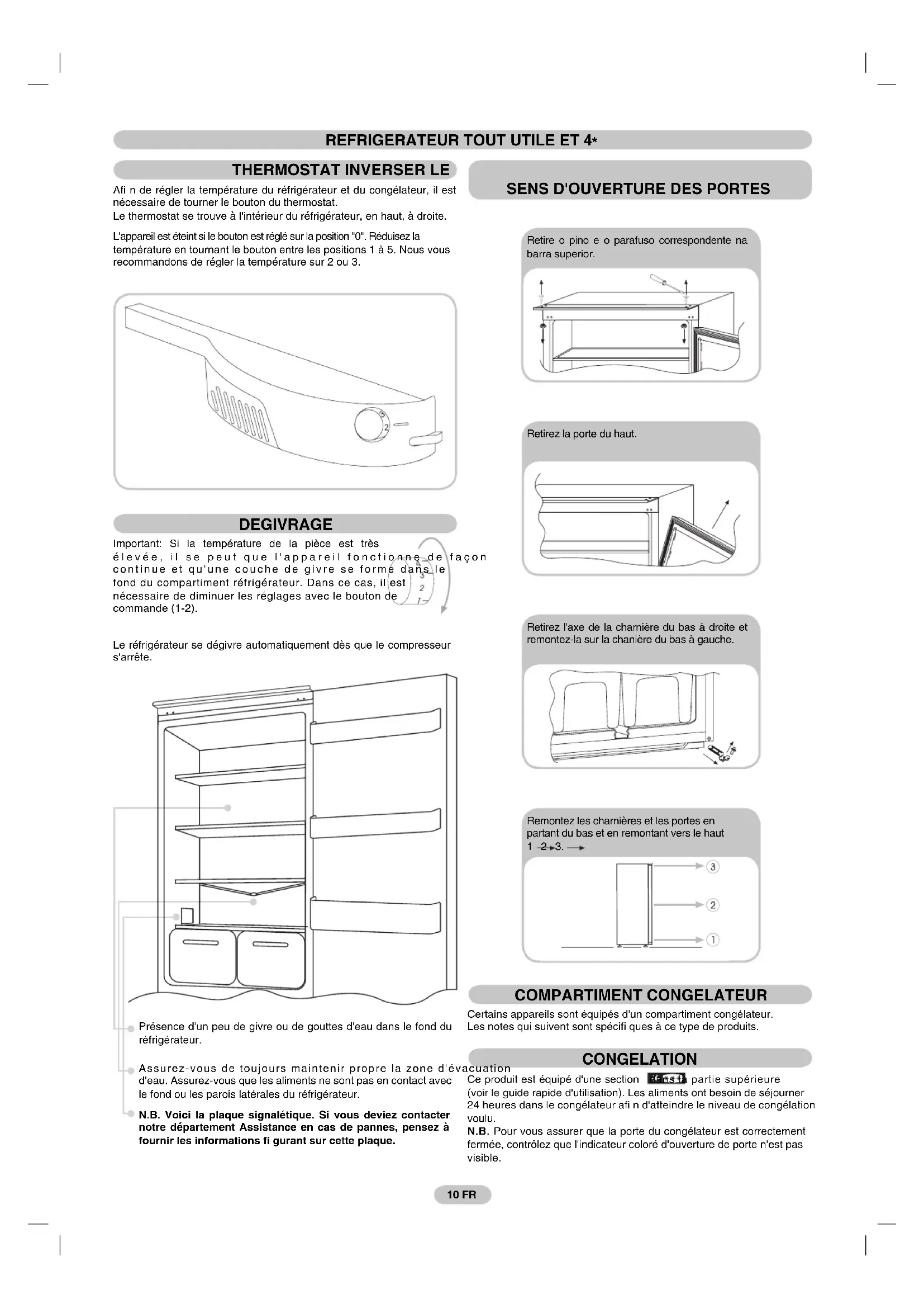 Afi n de régler la température du réfrigérateur et du congélateur, il est nécessaire de tourner le bouton du thermostat. Le thermostat se trouve à l'intérieur du réfrigérateur, en haut, à droite. L'appareil est éteint si le bouton est réglé sur la position "0". Réduisez la température en tournant le bouton entre les positions 1 à 5. Nous vous recommandons de régler la température sur 2 ou 3. DEGIVRAGE Important: Si la température de la pièce est très élevée, il se peut que l'appareil fonctionne de façon continue et qu'une couche de givre se forme dans le fond du compartiment réfrigérateur. Dans ce cas, il est nécessaire de diminuer les réglages avec le bouton de commande (1-2). Le réfrigérateur se dégivre automatiquement dès que le compresseur s'arrête. Présence d'un peu de givre ou de gouttes d'eau dans le fond du réfrigérateur. Assurez-vous de toujours maintenir propre la zone d'évacuation d'eau. Assurez-vous que les aliments ne sont pas en contact avec le fond ou les parois latérales du réfrigérateur. N.B. Voici la plaque signalétique. Si vous deviez contacter notre département Assistance en cas de pannes, pensez à fournir les informations fi gurant sur cette plaque. Retire o pino e o parafuso correspondente na barra superior. Retirez la porte du haut. Retirez l'axe de la charnière du bas à droite et remontez-la sur la chanière du bas à gauche. Remontez les charnières et les portes en partant du bas et en remontant vers le haut