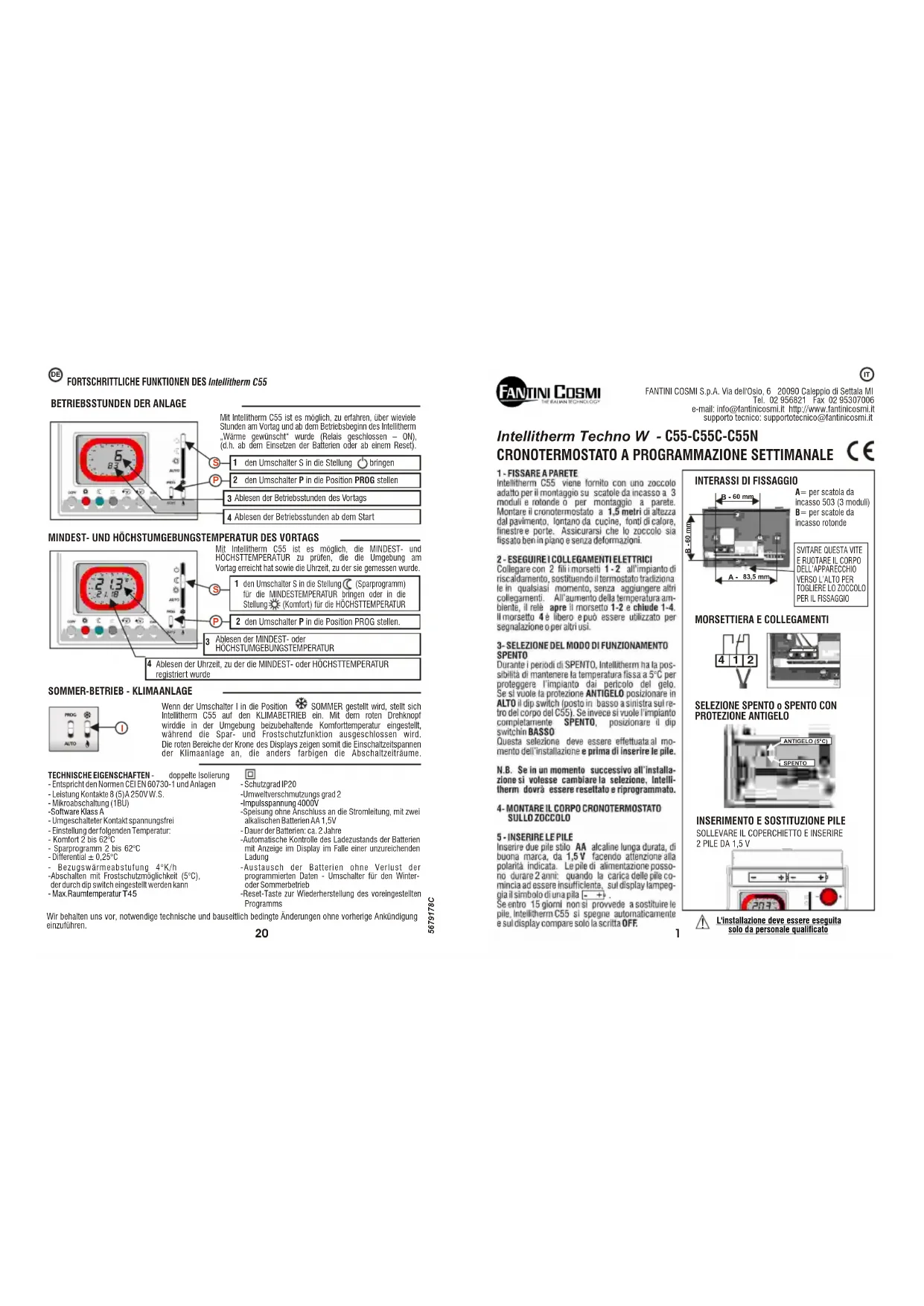 La société se réserve le droit d'apporter sans avis préalable toute modification technique ou de fabrication qu'elle jugerait nécessaire. CARACTÉRISTIQUES TECHNIQUES - double isolement-Conforme aux normes CEI EN 60730-1 et ses - Indice de protection IP20modifications.- Degré de pollution 2- Portée des contacts 8 (5) A / 250 V c.a.- Micro-déconnexion (1BU)- Alimentation sans connexions à la ligne électrique avec 2 piles alcalines AA 1,5 V- Contact en commutation libre de tension- Durée des piles : environ 2 ans- Réglage de la température de :- Contrôle automatique de l’état de charge des piles avec - confort de 2 °C à 62 °Caffichage sur l’écran en cas de charge insuffisante- économie de 2 °C à 62 °C- Remplacement des piles sans perte des données - Différentiel ± 0,25 °C.programmées- Gradient de température de référence 4 °K/h.- Interrupteur pour le fonctionnement hivernal ou estival- Arrêt avec possibilité de protection antigel (5 °C) - Bouton de réinitialisation pour rétablir le programme pré-programmable par commutateur DIP.configuré - T - Dimensions : 120 x 80 x 27 mm- Impulsion de tension 4000V- Software classe Aemperatura maxima ambiente T45 Lorsque l’interrupteur I est déplacé sur ÉTÉ, Intellitherm C55 se prépare au fonctionnement du système de CLIMATISATION. Avec la poignée rouge, il est possible de régler la température de confort qui doit être aintenue dans le local, tandis que les fonctionnements « économie » et « antigel » sont exclus. Les secteurs rouges de la couronne sur l’écran indiquent donc les périodes d’allumage du système de climatisation, et les secteurs d’autres couleurs, les périodes d’arrêt. Via dell'Osio, 6 - 20090 Caleppio di Settala (MI) - ITALY International calls: Phone no. +39 02 95682222 Fax no. +39 02 95307006 xport@fantinicosmi.it http//www.fantinicosmi.come-mail: e Avec Intellitherm C55, il est possible de connaître la durée de la demande de chaleur (relais fermé - ON) le jour précédent et depuis le début du fonctionnement d’Intellitherm (c’est-à-dire, depuis la dernière introduction des piles ou depuis la dernière réinitialisation). déplacer le commutateur S surdéplacer l’interrupteur P sur PROG lecture des heures de fonctionnement du premier jourlecture des heures de fonctionnement depuis le démarrage