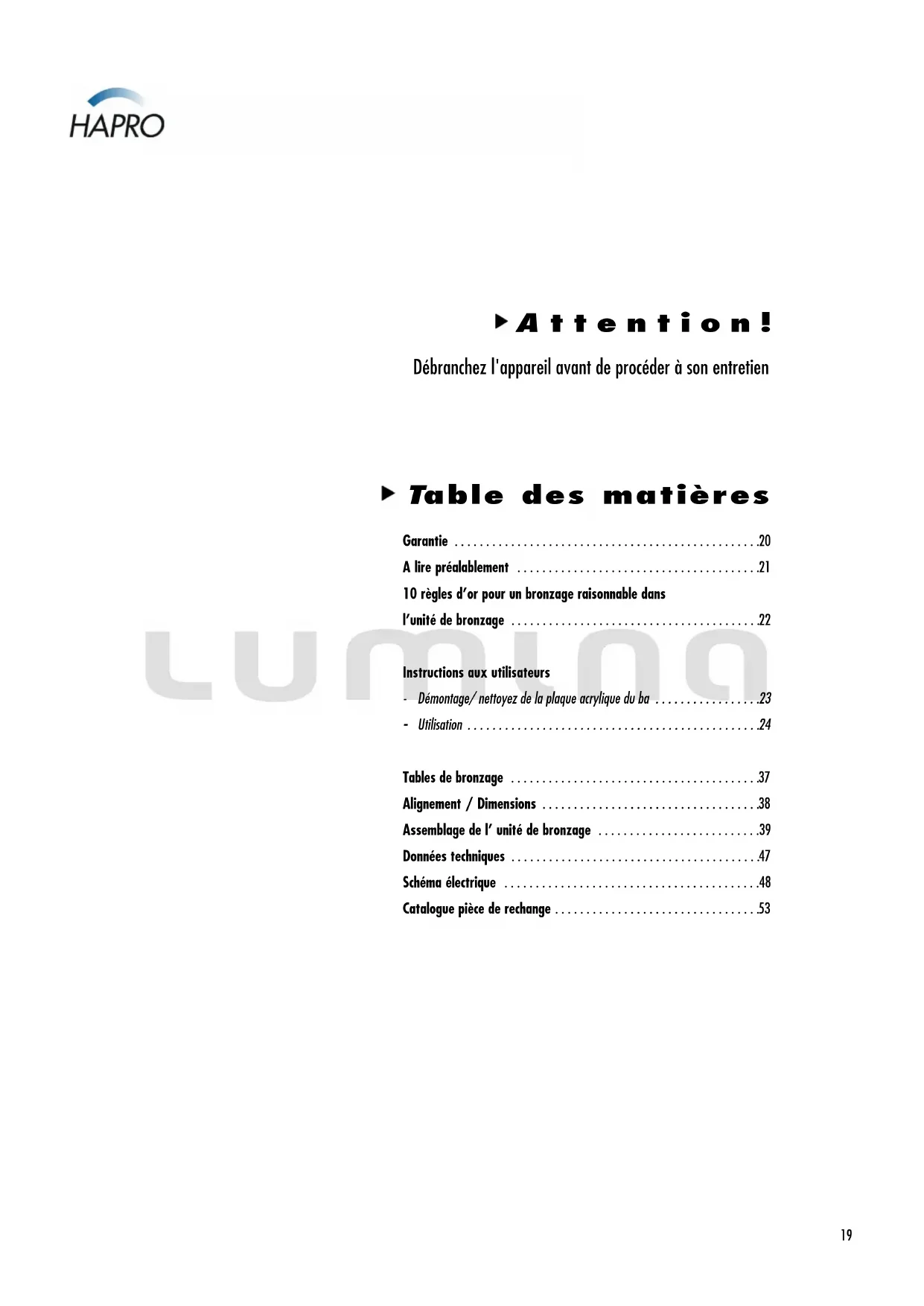 1 Prenez immédiatement contact avec votre revendeur agréé Hapro si l'unité ne fonctionne pas tel que décrit dans ce manuel. 2 Ne faibles pas fonctionner cette unité dans un endroit humide. 3 Assurez-vous toujours que les fusibles sont capables de supporter la charge. Cette unité doit être protégée par un interrupteur de court-circuit à la masse (GFCI) ou 0.03A. Si l'installation n'est pas connectée au moyen d'une prise, un dispositif d'installation ou un commutateur tous pôles devra être placé. 4 Débranchez toujours la prise de courant de l'unité lorsque vous entretenez ou nettoyez la structure interne de la cabine. Tout entretien dont la procédure n'est pas décrite dans le présent manuel ne devrait être effectué que par un électricien qualifié. N'utilisez en aucun cas des produits à base d'alcool qui pourraient détériorer la plaque. 5 Lors de l'installation de l'appareil, veillez à prendre en compte les distances minimales recommandées, indiquées dans le chapitre Dimensions / Mise en place. 6 Si l'appareil doit être placé dans une cabine, les parois doivent de préférence disposer de l'espace minimum requis, les distances minimales étant reprises dans le chapitre "Montage de l'appareil de bronzage". Ceci est nécessaire pour assurer une bonne circulation de l'air autour de l'appareil. 7 Évitez que la plaque acrylique n'entre en contact avec des objets tranchants. 8 L'appareil ne peut être utilisé si : l'utilisateur ne porte pas de lunettes de protection contre les UV ; il n'y a pas de plaque acrylique sur l'appareil de bronzage ; la ventilation de l'appareil ne fonctionne pas de manière optimale ; la température à l'intérieur de la cabine est égale ou supérieure à 30°C. Le Lumina doit toujours être connecté sur une minuterie externe.