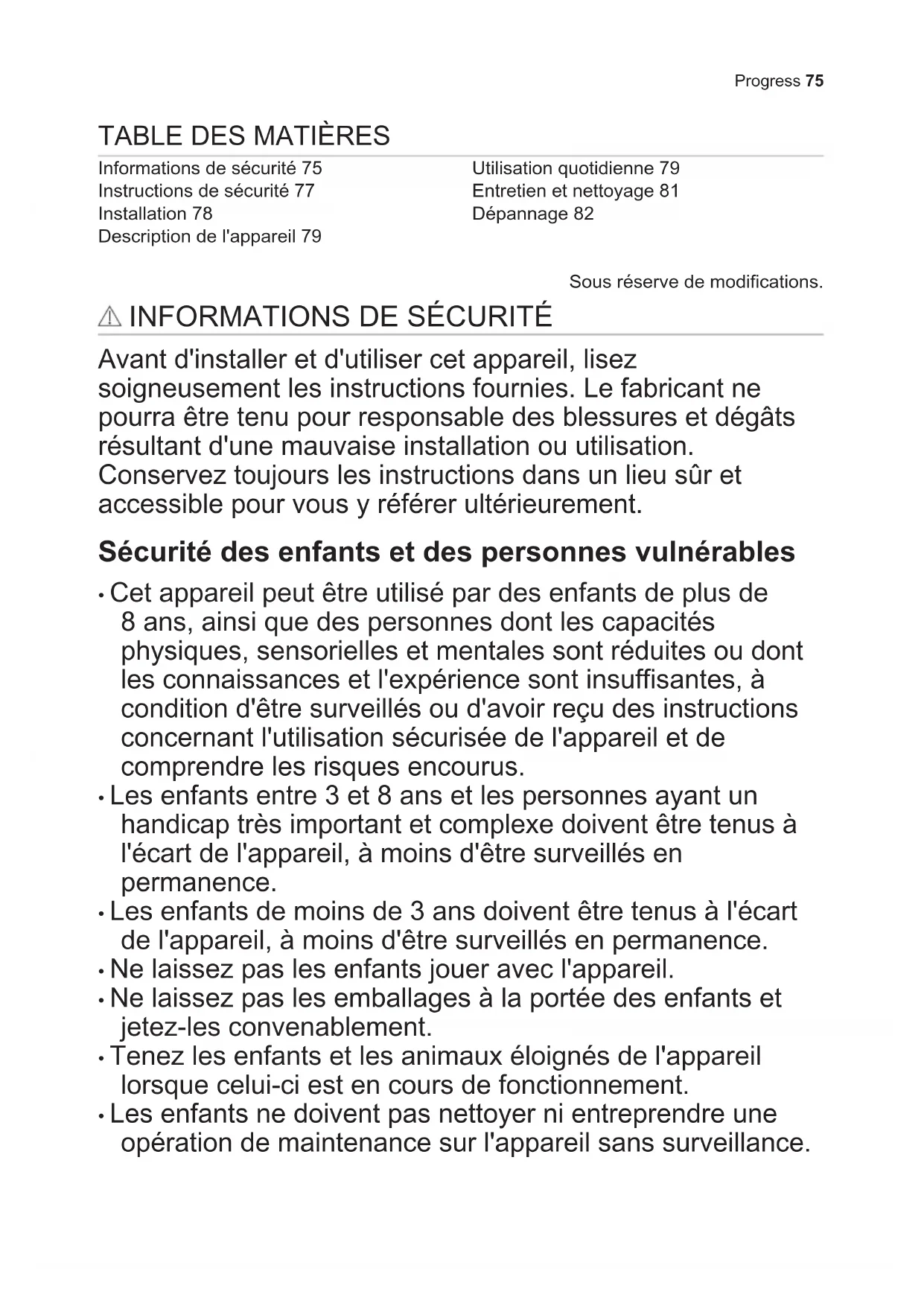 - Les enfants ne doivent pas nettoyer ni entreprendre une opération de maintenance sur l'appareil sans surveillance. Progress 75Consignes générales de sécurité