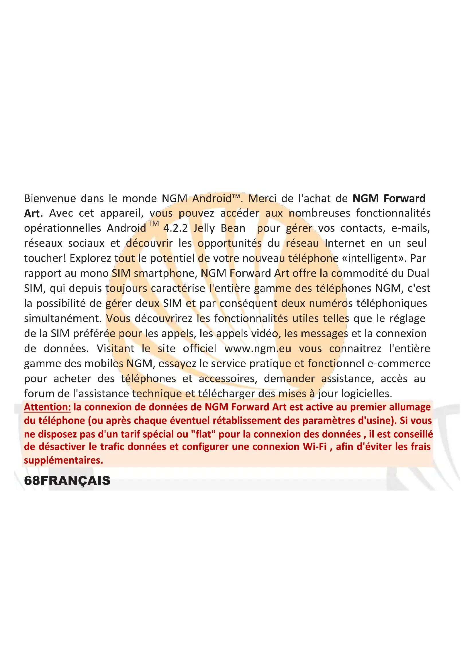réseaux sociaux et découvrir les opportunités du réseau Internet en un seul toucher! Explorez tout le potentiel de votre nouveau téléphone «intelligent». Par rapport au mono SIM smartphone, NGM Forward Art offre la commodité du Dual SIM, qui depuis toujours caractérise l'entière gamme des téléphones NGM, c'est la possibilité de gérer deux SIM et par conséquent deux numéros téléphoniques simultanément. Vous découvrirez les fonctionnalités utiles telles que le réglage de la SIM préférée pour les appels, les appels vidéo, les messages et la connexion de données. Visitant le site officiel www.ngm.eu vous connaitrez l'entière gamme des mobiles NGM, essayez le service pratique et fonctionnel e-commerce pour acheter des téléphones et accessoires, demander assistance, accès au forum de l'assistance technique et télécharger des mises à jour logicielles. Attention: la connexion de données de NGM Forward Art est active au premier allumage du téléphone (ou après chaque éventuel rétablissement des paramètres d'usine). Si vous ne disposez pas d'un tarif spécial ou "flat" pour la connexion des données , il est conseillé de désactiver le trafic données et configurer une connexion Wi-Fi , afin d'éviter les frais supplémentaires.69FRANÇAIS Assemblage