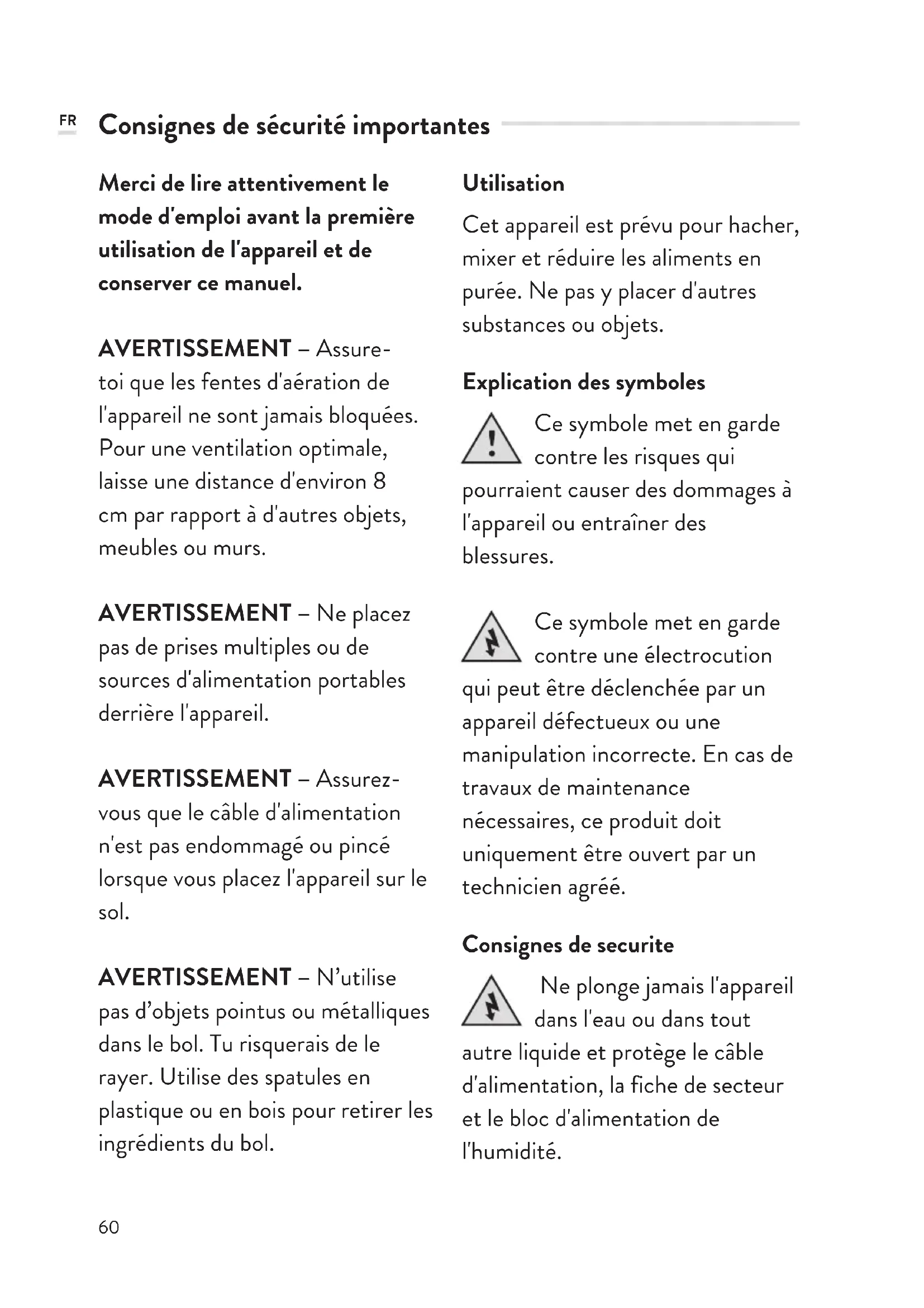 - Cet apparéil est prévu pour hacher, mixer et réduire les aliments en purée. Ne pas y placer d'autres substances ou objets.