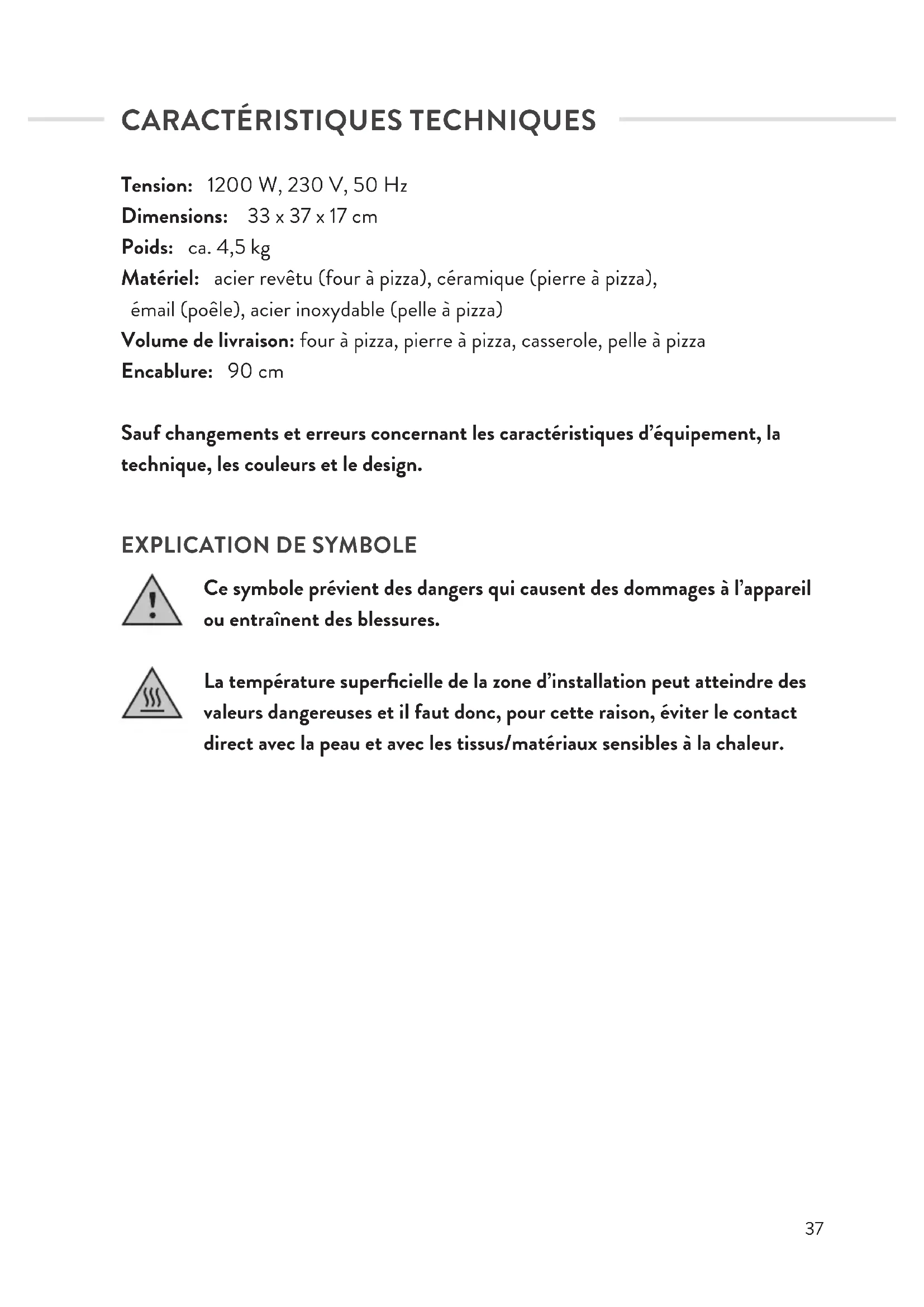 Volume de livraison: four à pizza, pierre à pizza, casserole, pelle à pizza