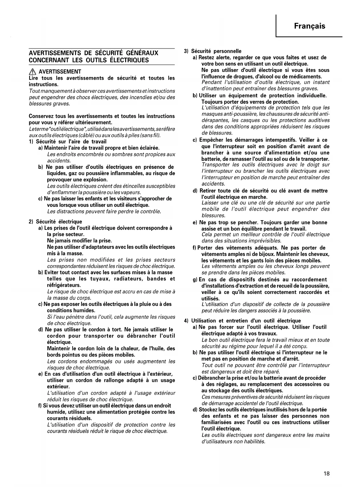 AVERTISSEMENT Lire tous les avertissements de sécurité et toutes les instructions. Tout manquement à observer ces avertissements et instructions peut engendrer des chocs électriques, des incendies et/ou des blessures graves. Conservez tous les avertissements et toutes les instructions pour vous y référer ultérieurement. Le terme "outil électrique", utilisé dans les avertissements, se réfère aux outils électriques (câblé) ou aux outils à piles (sans fil).