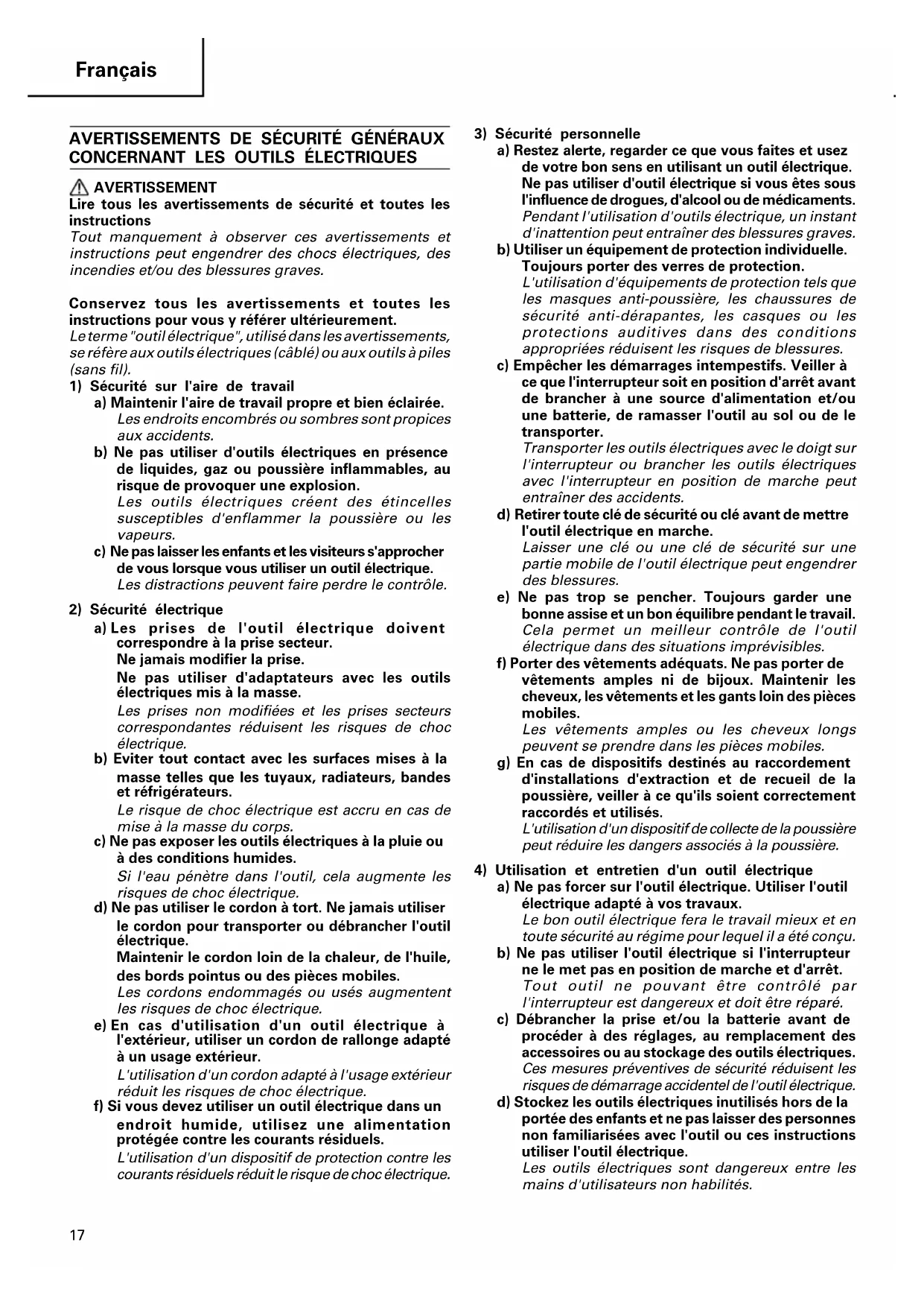 AVERTISSEMENT Lire tous les avertissements de sécurité et toutes les instructions Tout manquement à observer ces avertissements et instructions peut engendrer des chocs électriques, des incendies et/ou des blessures graves. Conservez tous les avertissements et toutes les instructions pour vous y référer ultérieurement. Le terme "outil électrique", utilisé dans les avertissements, se réfère aux outils électriques (câblé) ou aux outils à piles (sans fil).