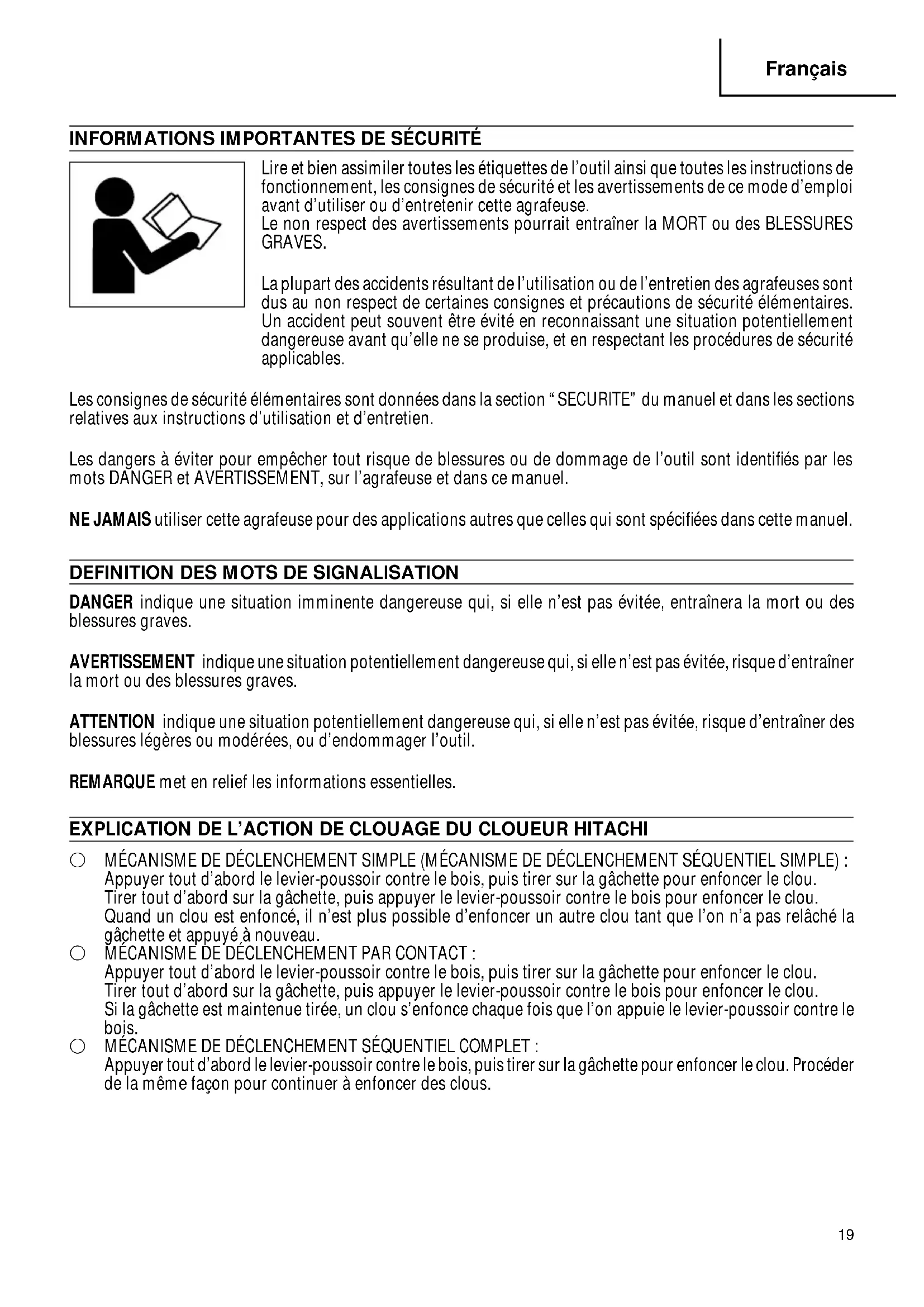 DANGER indique une situation imminente dangereuse qui, si elle n’est pas évitée, entraînera la mort ou des blessures graves. AVERTISSEMENT indique une situation potentiellement dangereuse qui, si elle n’est pas évitée, risque d’entraîner la mort ou des blessures graves. ATTENTION indique une situation potentiellement dangereuse qui, si elle n’est pas évitée, risque d’entraîner des blessures légères ou modérées, ou d’endommager l’outil. REMARQUE met en relief les informations essentielles. EXPLICATION DE L’ACTION DE CLOUAGE DU CLOUEUR HITACHI