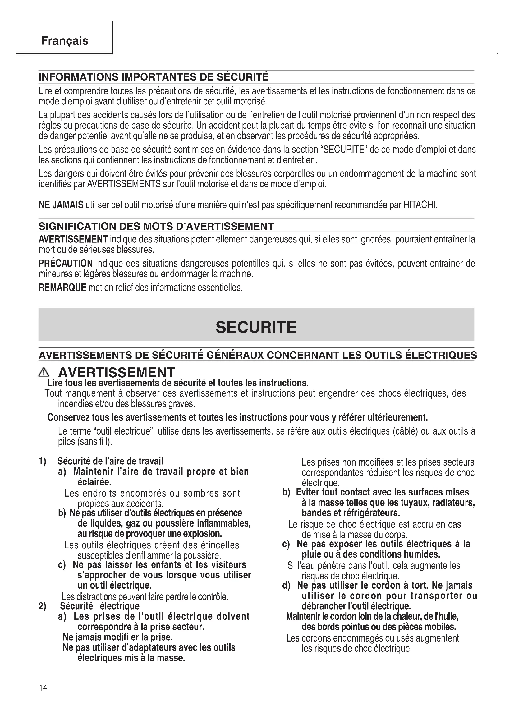 Lire et comprendre toutes les précautions de sécurité, les avertissements et les instructions de fonctionnement dans ce mode d’emploi avant d’utiliser ou d’entretenir cet outil motorisé. La plupart des accidents causés lors de l’utilisation ou de l’entretien de l’outil motorisé proviennent d’un non respect des règles ou précautions de base de sécurité. Un accident peut la plupart du temps être évité si l’on reconnaît une situation de danger potentiel avant qu’elle ne se produise, et en observant les procédures de sécurité appropriées. Les précautions de base de sécurité sont mises en évidence dans la section “SECURITE” de ce mode d’emploi et dans les sections qui contiennent les instructions de fonctionnement et d’entretien. Les dangers qui doivent être évités pour prévenir des blessures corporelles ou un endommagement de la machine sont identifi és par AVERTISSEMENTS sur l’outil motorisé et dans ce mode d’emploi. NE JAMAIS utiliser cet outil motorisé d’une manière qui n’est pas spécifi quement recommandée par HITACHI.
