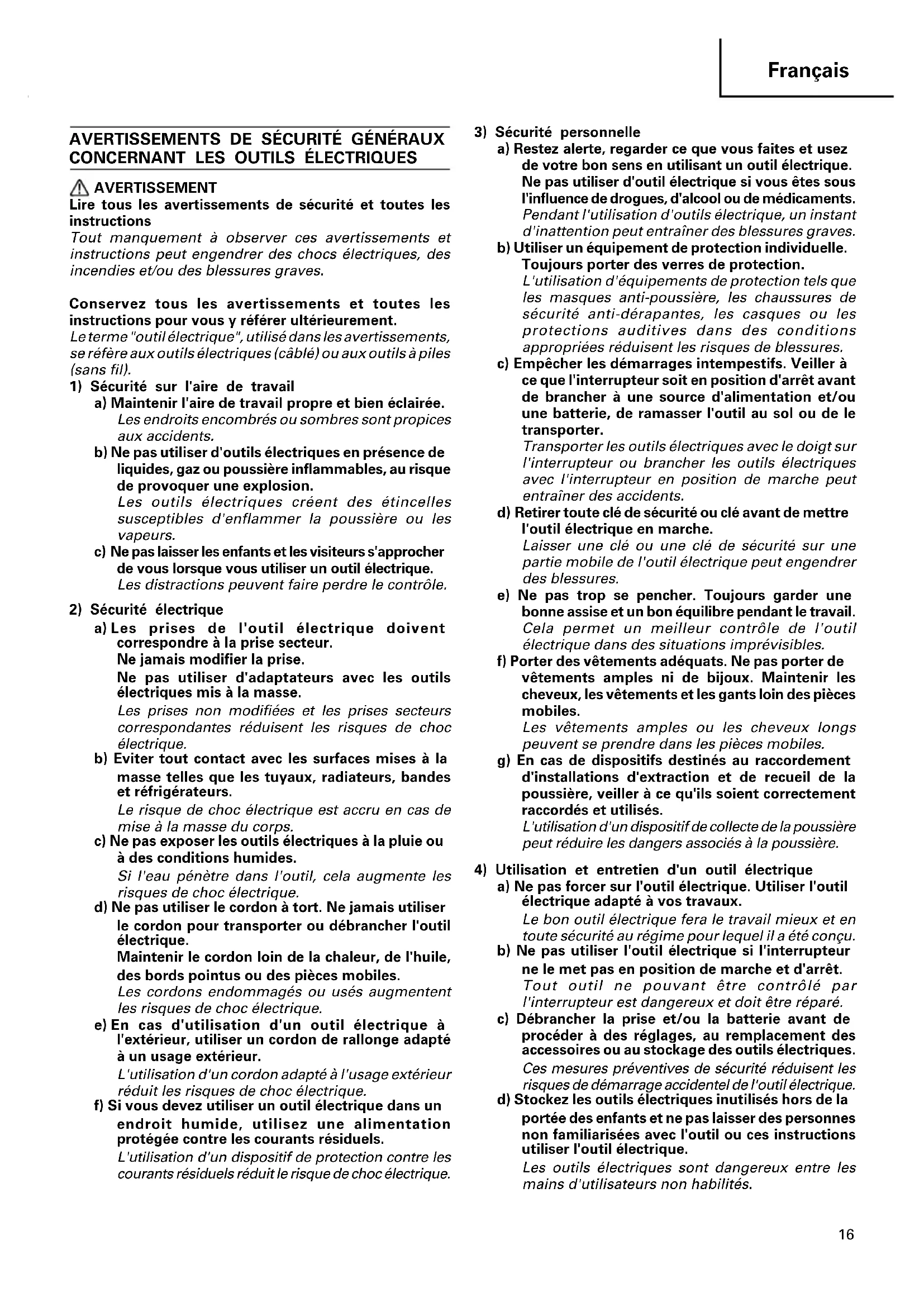 AVERTISSEMENT Lire tous les avertissements de sécurité et toutes les instructions Tout manquement à observer ces avertissements et instructions peut engendrer des chocs électriques, des incendies et/ou des blessures graves. Conservez tous les avertissements et toutes les instructions pour vous y référer ultérieurement. Le terme "outil électrique", utilisé dans les avertissements, se réfère aux outils électriques (câblé) ou aux outils à piles (sans fil).