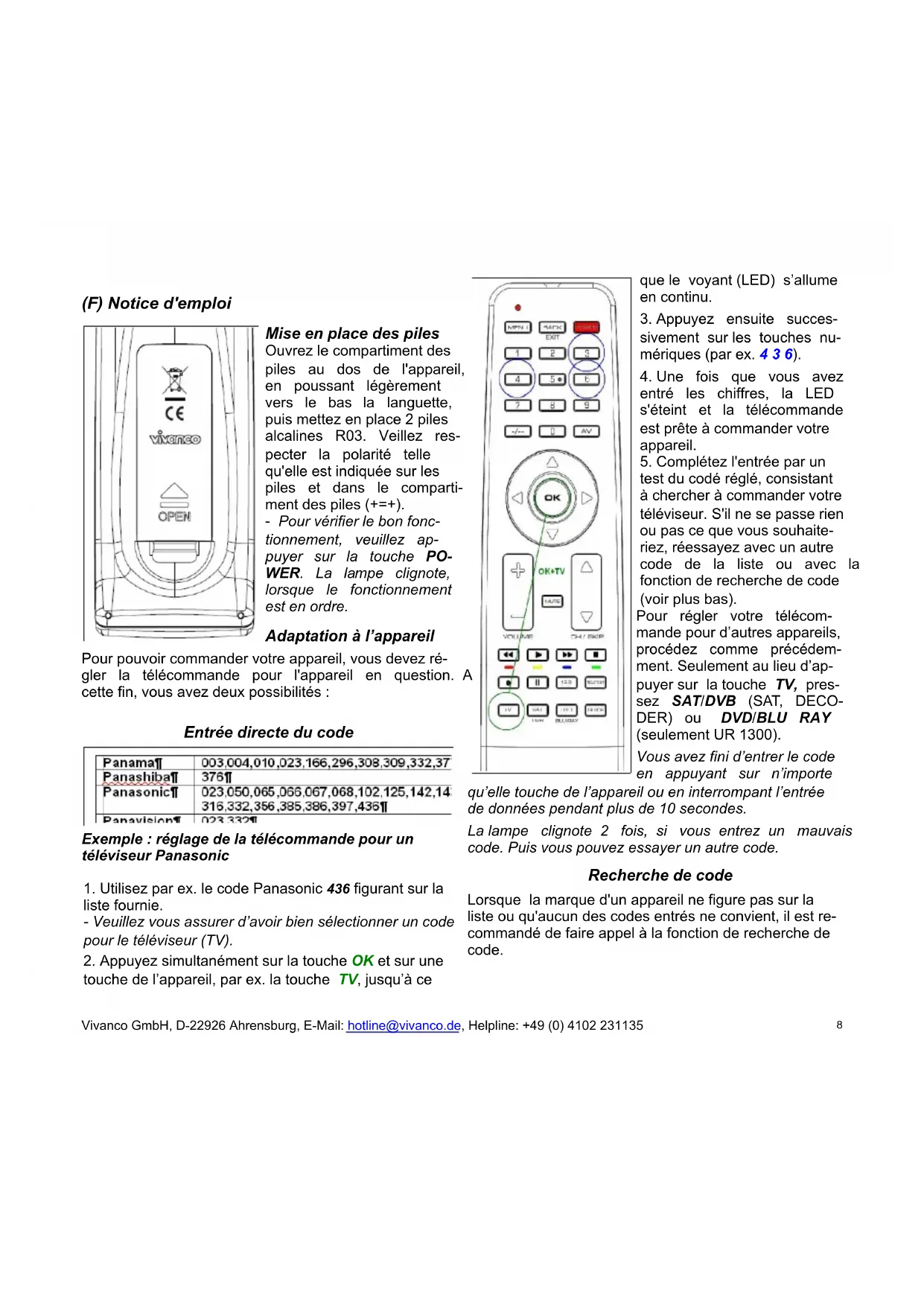 test du codé réglé, consistant à chercher à commander votre téléviseur. S'il ne se passe rien ou pas ce que vous souhaite- riez, réessayez avec un autre code de la liste ou avec la fonction de recherche de code (voir plus bas). Pour régler votre télécom- mande pour d’autres appareils, procédez comme précédem- ment. Seulement au lieu d’ap- puyer sur la touche TV, pres- sez SAT/DVB (SAT, DECO- DER) ou DVD/BLU RAY (seulement UR 1300). Vous avez fini d’entrer le code en appuyant sur n’importe qu’elle touche de l’appareil ou en interrompant l’entrée de données pendant plus de 10 secondes. La lampe clignote 2 fois, si vous entrez un mauvais code. Puis vous pouvez essayer un autre code. Recherche de code Lorsque la marque d'un appareil ne figure pas sur la liste ou qu'aucun des codes entrés ne convient, il est re- commandé de faire appel à la fonction de recherche de code. Vivanco GmbH, D-22926 Ahrensburg, E-Mail: hotline@vivanco.de, Helpline: +49 (0) 4102 231135 8Recherche manuelle de code
