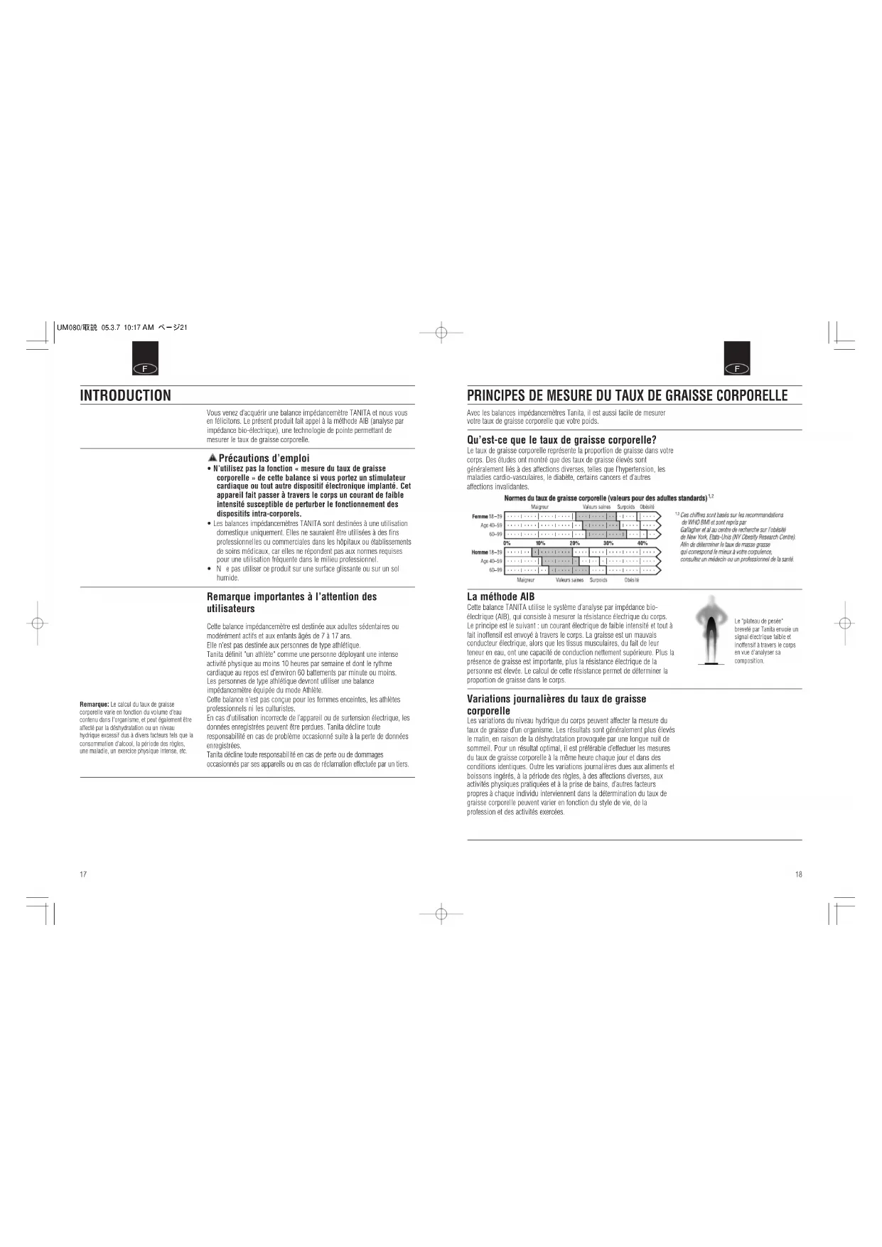 UM080/取説05.3.710:17AMページ19F PRINCIPES DE MESURE DU TAUX DE GRAISSE CORPORELLE Avec les balances impédancemètres Tanita, il est aussi facile de mesurer votre taux de graisse corporelle que votre poids. Qu’est-ce que le taux de graisse corporelle? Le taux de graisse corporelle représente la proportion de graisse dans votre corps. Des études ont montré que des taux de graisse élevés sont généralement liés à des affections diverses, telles que l’hypertension, les maladies cardio-vasculaires, le diabète, certains cancers et d’autres affections invalidantes. La méthode AIB Cette balance TANITA utilise le système d’analyse par impédance bio- électrique (AIB), qui consiste à mesurer la résistance électrique du corps. Le principe est le suivant : un courant électrique de faible intensité et tout à fait inoffensif est envoyé à travers le corps. La graisse est un mauvais conducteur électrique, alors que les tissus musculaires, du fait de leur teneur en eau, ont une capacité de conduction nettement supérieure. Plus la présence de graisse est importante, plus la résistance électrique de la personne est élevée. Le calcul de cette résistance permet de déterminer la proportion de graisse dans le corps. Variations journalières du taux de graisse corporelle Les variations du niveau hydrique du corps peuvent affecter la mesure du taux de graisse d’un organisme. Les résultats sont généralement plus élevés le matin, en raison de la déshydratation provoquée par une longue nuit de sommeil. Pour un résultat optimal, il est préférable d’effectuer les mesures du taux de graisse corporelle à la même heure chaque jour et dans des conditions identiques. Outre les variations journalières dues aux aliments et boissons ingérés, à la période des règles, à des affections diverses, aux activités physiques pratiquées et à la prise de bains, d’autres facteurs propres à chaque individu interviennent dans la détermination du taux de graisse corporelle peuvent varier en fonction du style de vie, de la profession et des activités exercées. Le "plateau de pesée"breveté par Tanita envoie unsignal électrique faible etinoffensif à travers le corpsen vue d'analyser sacomposition.
