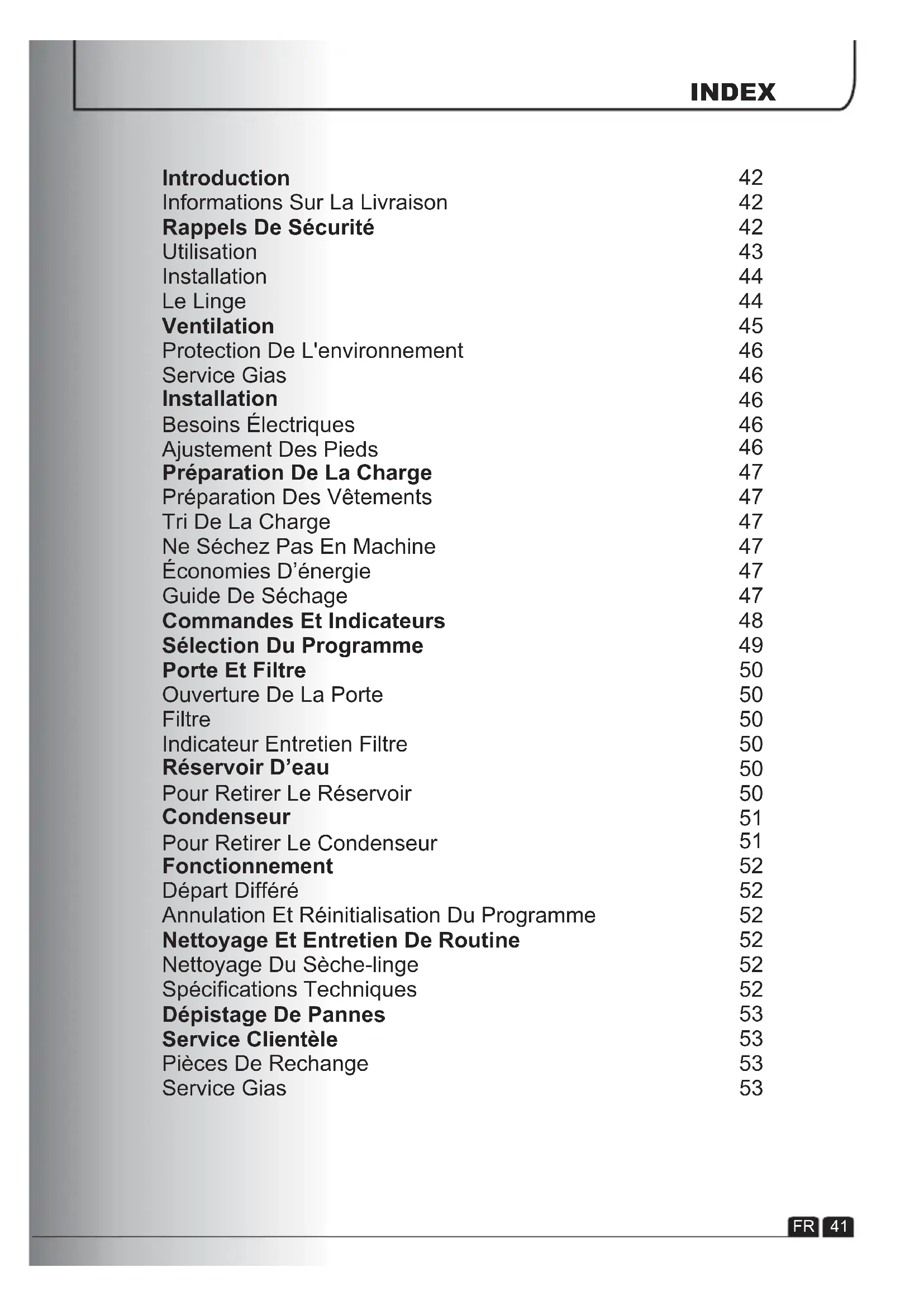 41INTRODUCTION Utilisation Vérifiez que les articles suivants ont bien été livrés avec l’appareil : ٴ Manuel d'utilisation ٴ Carte de garantie ٴ Étiquette d'énergie Veuillez lire et suivre ces instructions avec soin et utiliser la machine en conséquence. Ce livret contient des instructions importantes sur la sécurité d'utilisation, l'installation et l'entretien de la machine, ainsi que des conseils utiles pour obtenir les meilleurs résultats possibles lors de son utilisation. Conservez toute la documentation dans un endroit sûr pour pouvoir vous y reporter à une date ultérieure ou la transmettre aux prochains propriétaires Informations Sur La Livraison Le non-respect de ces instructions peut compromettre la sécurité de votre appareil. Un appel de service peut vous être facturé si la défaillance de votre appareil est causée par une mauvaise utilisation. Vérifiez que la machine ne s'est pas détériorée en transit. Si c'est le cas, contactez GIAS pour une opération de dépannage.