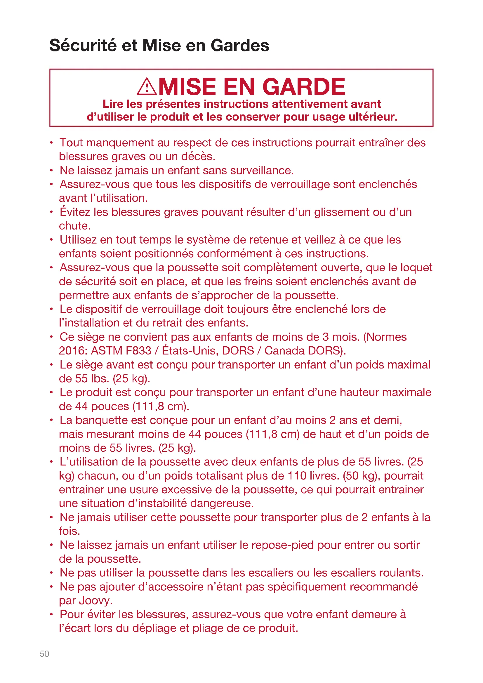 - Les enfants peuvent suoquer sur de la literie moelleuse. Ne pas placer des oreillers, des couettes ou des matelas moelleux dans ce moïse.98 Entretien et Maintenance Entretien Tous les accessoires, boutons-pression, serrures, rivets et autre quincaillerie et pièces de plastique de la poussette doivent être inspectés périodiquement an de s’assurer qu’ils sont adéquatement xés et non endommagés ou défectueux. Le harnais de sécurité, ainsi que toutes les autres sangles et pièces en tissu et leurs coutures doivent également être inspectés périodiquement an d’assurer qu’ils sont adéquatement xés et ne sont pas mal posés, déchirés ou endommagés. Toutes les pièces amovibles, telles que les roues, les freins et les charnières doivent également être vériées périodiquement an d’assurer leur bon fonctionnement. Tout composante manquante, brisée ou usée doit être remplacée immédiatement, et la poussette ne doit pas être utilisée jusqu’à ce que le remplacement ait été eectué. Seules les composantes du fabricant d’origine doivent être utilisées. Si nécessaire, veuillez contacter Joovy via notre numéro de téléphone sans frais. Nettoyage Le tissu sur cette poussette peut être nettoyé avec du savon doux ou un détergent et de l’eau tiède sur une éponge ou un chion propre. Le tissu du siège est lavable à la machine. Retirez le cadre métallique et les panneaux PE du siège avant le lavage. Ne pas utiliser de solvants, produits de nettoyage caustiques ou abrasifs. Pour minimiser le rétrécissement, rexez simplement le siège au châssis pour sécher. Ne pas presser, repasser, nettoyer à sec, sécher à la machine ou tordre le tissu. Toujours laisser le tissu sécher complètement à l’air avant d’utiliser la poussette. Le cadre et les roues doivent toujours être propres et exempts de saleté et de matières étrangères, surtout après l’utilisation de la poussette sous la pluie, la neige ou dans d’autres environnements diciles. Utilisez une éponge ou un chion humide avec de l’eau tiède et un détergent doux pour nettoyer les roues après une telle utilisation. Consultez la sectionsur le recouvrement de siège pour les informations relatives au retrait du recouvrement de siègepour le lavage (page 66). Espace de rangement La lumière directe du soleil pourrait entraîner la décoloration du tissu et le durcissement des roues. Gardez la poussette à l’intérieur pour prolonger son apparence. NE PAS entreposer à l’extérieur. Assurez-vous que la poussette est sèche avant de la ranger pour des périodes prolongées. Toujours entreposer la poussette dans un environnement sec. Rangez la poussette dans un endroit sécuritaire lorsqu’elle n’est pas utilisée. (soit à l’écart des enfants). NE PAS placer des objets lourds sur le dessus de la poussette. Ne pas ranger la poussette à proximité d’une source de chaleur directe, comme un radiateur ou un feu ouvert.direct heat source such as a radiator or open re.99 Service à la Clientèle Veuillez ne pas retourner ce produit en magasin. Si vous rencontrez des dicultés lors de l’assemblage ou de l’utilisation de ce produit, ou si vous avez une question au sujet de ces instructions, veuillez communiquer avec notre service à la clientèle: États Unis Joovy (877) 456-5049, 8h30 – 17h00, heure du Centre Discussion en direct joovy.com, 8h30 – 21h00, heure du Centre customerservice@joovy.com Canada Elfe Juvenile Products (800) 667-8184, 8h30 – 17h00, heure de l’Est Corée Joy Partners Limited Korea (822) 2248-3384, 9h00 – 18h00 GMT+9 @joovy100 Seguridad y Advertencias