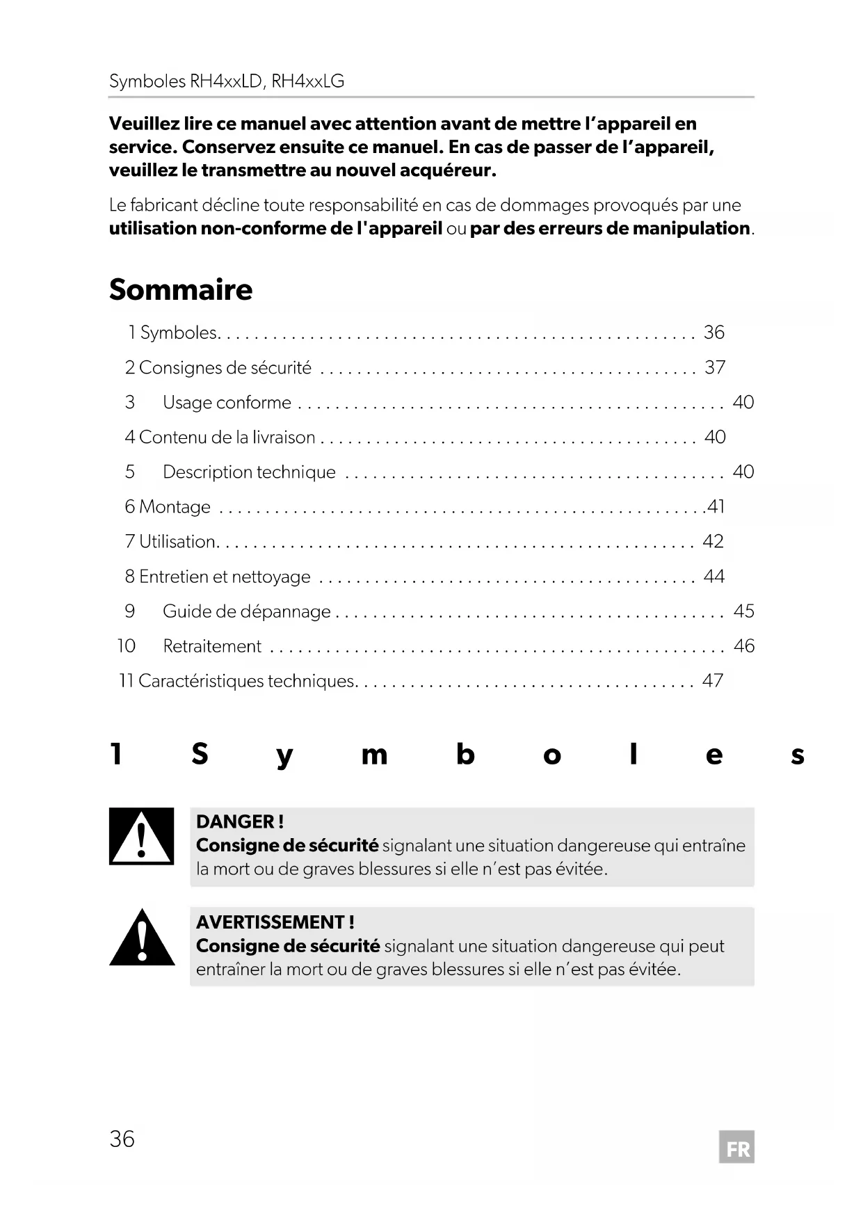 DANGER ! Consigne de sécurité signalant une situation dangereuse qui entraîne la mort ou de graves blessures si elle n’est pas évitée. AVERTISSEMENT ! Consigne de sécurité signalant une situation dangereuse qui peut entraîner la mort ou de graves blessures si elle n’est pas évitée. RH430-RH440-RH460-LD-LG--IO-16s.book Seite 36 Mittwoch, 17. Juli 2019 5:35 17FR RH4xxLD, RH4xxLG Consignes de sécurité