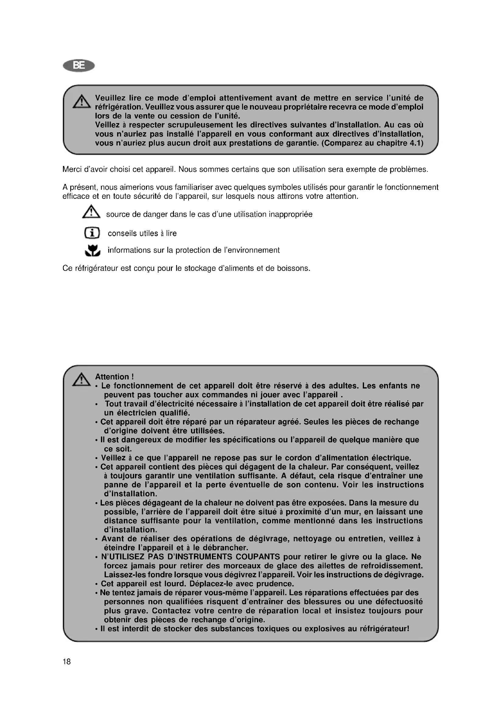 Veuillez lire ce mode d’emploi attentivement avant de mettre en service l’unité de réfrigération. Veuillez vous assurer que le nouveau propriétaire recevra ce mode d’emploi lors de la vente ou cession de l’unité. Veillez à respecter scrupuleusement les directives suivantes d’installation. Au cas où vous n’auriez pas installé l’appareil en vous conformant aux directives d’installation, vous n’auriez plus aucun droit aux prestations de garantie. (Comparez au chapitre 4.1) Merci d’avoir choisi cet appareil. Nous sommes certains que son utilisation sera exempte de problèmes. A présent, nous aimerions vous familiariser avec quelques symboles utilisés pour garantir le fonctionnement efficace et en toute sécurité de l’appareil, sur lesquels nous attirons votre attention. source de danger dans le cas d’une utilisation inappropriée conseils utiles à lire informations sur la protection de l’environnement Ce réfrigérateur est conçu pour le stockage d’aliments et de boissons. Attention !