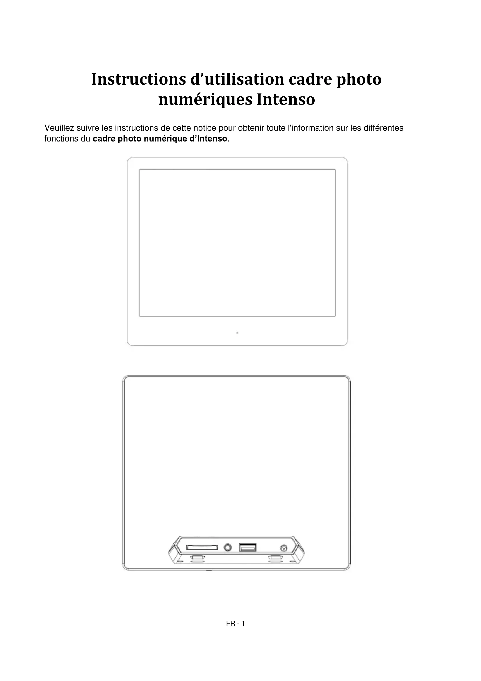 Nous espérons que l’Intenso cadre photo numérique vous fait plaisir!FR - 9 Soin et Entretien Soin Pour éviter des décharges électriques n’enlevez ni les vis ni le boîtier. N’utilisez pas cet appareil à proximité de l’eau. N’exposez pas l’appareil à la pluie ou à l’humidité. Ne posez pas des objets contenant de l’eau ou d’autres liquides à côté de l’appareil. N’installez pas ce cadre photo numérique à proximité de chauffages, de poêles ou d’autres appareils émettant de la chaleur. N’ouvrez pas le boîtier. N’essayez pas de réparer l’appareil. Il doit être réparé par des spécialistes. N’utilisez pas l’appareil à des endroits sablonneux. Mettez le connecteur adapteur du bloc d’alimentation complètement dans l’orifice du CPN. Ainsi, vous évitez des chargements électrostatiques. Connecter tous les raccordements correctement et sûrement. N’appuyez pas sur l’écran. Protégez l’écran d’une pénétration du soleil trop forte. Le cadre photo numérique ne peut lire que des formats compatibles. Des images peuvent être soumises au copyright. L’affi chage sans licence peut désobéir aux droits copyright. Ne touchez pas le CPN avec des objets métalliques pendant le fonctionnement. Evitez l’utilisation sur des coussins, des canapés d’autres objets qui soutiennent une thermogénie, car l’appareil risque d’être surchauffé. N’enlevez pas de cartes de mémoire pendant la lecture. Sinon, il peut y avoir des bocages de système ou des pertes de données. Ne mettez pas l’appareil hors marche pendant un diaporama. N’emballez pas l’appareil directement après une utilisation de longue durée. Assurez un refroidissment suffissant. Sinon, l’appareil risque d’être surchauffé. Pour garantir un meilleur service, il peut y avoir des changements dans le mode d’emploi.