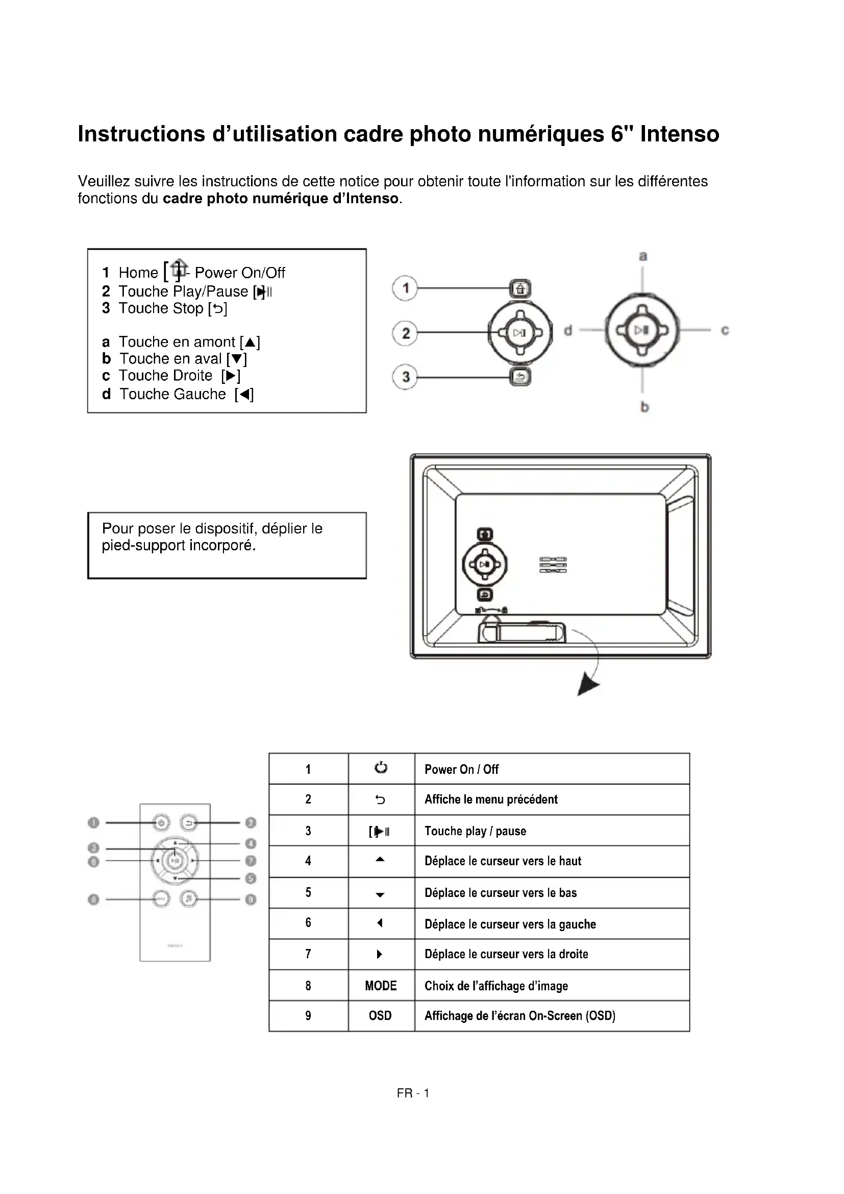 Possibilités de réglage Description Généralités setup Langue Choisissez la langue souhaitée. Informations produit Affichage de la version actuelle de la microprogrammation. Mise à jour de la microprogrammation Si une mise à jour devait être disponible sur le site Internet www.intenso.de pour la microprogrammation, celle-ci peut être installée via cette option de menu. Réglages usine L'appareil est réinitialisé aux réglages d’usine. Auto run Ajustez ici le mode par lequel votre cadre photo doit démarrer après la mise sous tension. (photo, calendrier, dernière fonction utilisée) ECO Luminosité Réglage de la luminosité de l’écran d’affichage TFT. Mise hors tension Définissez ici le laps de temps à partir duquel l’appareil doit se mettre hors tension après la non utilisation Vidéo (Multimédias) Mode répétition Lire tout Toutes les vidéos prises en charge sont lues une fois. Répéter tout Toutes les vidéos prises en charge sont lues dans une boucle infinie. Répéter la vidéo actuelle la vidéo actuellement sélectionnée est répétée dans une boucle infinie. Aucune répétition La vidéo actuellement répétée est répétée une fois. Graduation Réglage des formats de visualisation pour la modalité vidéo (cinéma, original ou image pleine). Photo (Multimédias) Mode photo Sélection de différents modes d'affichage pour la visualisation de photos. Vous pouvez choisir entre l'affichage simple des photos, avec l'horloge, l'affichage du calendrier et un babillard avec 4 photos affichées simultanément. Fichier Sélection du dossier pour la reproduction de photos Musique en fond sonore Démarrage et arrêt de la musique en arrière-plan (si les fichiers de musique pris en charge sont disponibles sur le support multimédia). Diaporama Réglage de l’effet de passage Durée d'affichage Réglage de la durée d'affichage des images isolées en mode diaporama. Graduation Réglage du format d'affichage pour le mode photo. Ordre de lecture Sélection entre l'ordre de lecture normal et aléatoire.FR - 6 Musique (Multimédias) Fichier Sélection du répertoire pour la lecture de la musique. Ordre de lecture Sélection entre l'ordre de lecture normal et aléatoire. Mode répétition Lire tous les titres une fois Tous les titres pris en charge sont lus une fois. Répéter tous les titres Tous les titres pris en charge sont lus une fois dans une boucle infinie. Répéter la vidéo actuelle le titre actuellement sélectionné est répété dans une boucle infinie. Lire une fois Le titre actuellement sélectionné est lu une fois. Heure Date Ajuster de la date actuelle. Format horaire Ajuster le format horaire : 12 heures (/PM) ou 24 heures. Heure Ajuster l'heure actuelle. Modification de l'heure Réglage de précision de l'heure. Timer Mise sous tension / hors tension Activer/désactiver la mise sous tension / hors tension automatique. Temps de mise sous tension Réglage de l'heure de la mise sous tension automatique. Temps de mise hors tension Réglage de l'heure de la mise hors tension automatique. Fréquence Réglage de la fréquence de la mise sous tension/hors tension automatique. (quotidiennement, du lundi au vendredi, en fin de semaine, une fois) Alarme activée / désactivée Activez / désactivez l'alarme. Temps d'alarme Réglage du temps souhaité de l'alarme. Fréquence Réglage du mode de répétition souhaité pour l'alarme (chaque jour, de lundi à vendredi, weekend, une fois). Tonalité d'alarme Sélectionnez la tonalité d'alarme souhaitée.FR - 7